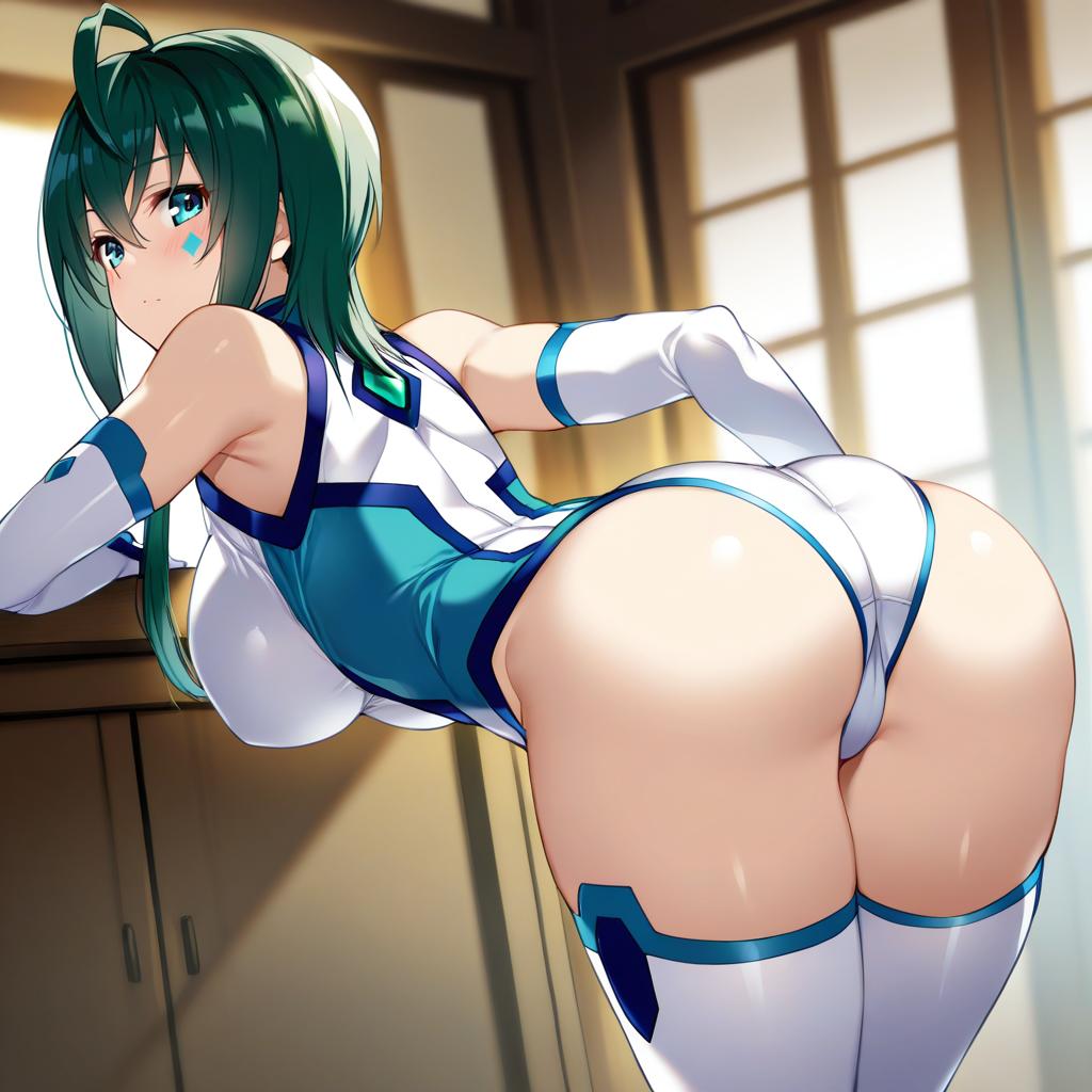 Kannagi itsuki, sora wo kakeru shoujo, 1girl, purple eyes, green hair, short hair, long hair, ahoge, large breasts, ass, blue leotard, white leotard, elbow gloves, thighhighs, facial mark, by artist ken (coffee michikusa), illustrious