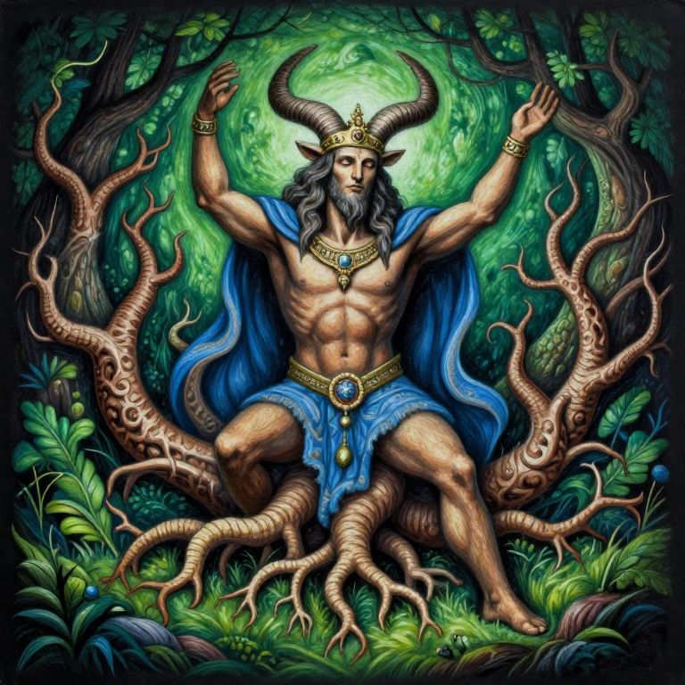 Digital fantasy artwork of a muscular, horned deity with a blue cloak, seated among twisted roots in a vibrant, green forest.