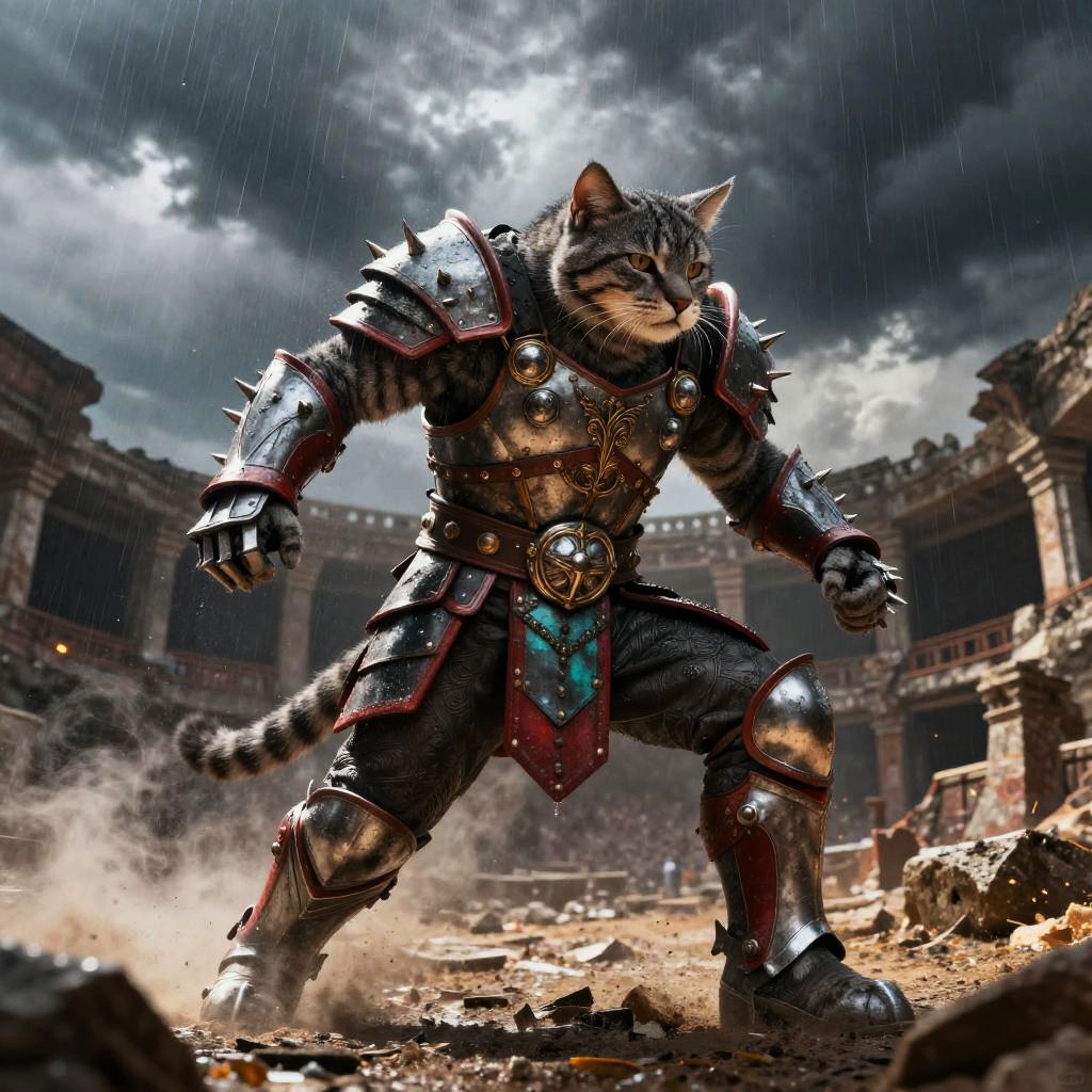 (full body) massive gray tabby Bobcat, armored gladiator with spiked gauntlets, in arena ruins under an ominous thundercloud, crimson, silver, and teal predominate, hyper-detailing, hyper-realism, tack sharp, cinematic splash screen energy, action-packed composition, dynamic pose, rain and sparks, smoke plumes, glossy reflections, dramatic rim light, volumetric fog, motion blur trails, embers, HDR, film grain, photoreal lighting, rich textures, epic mood