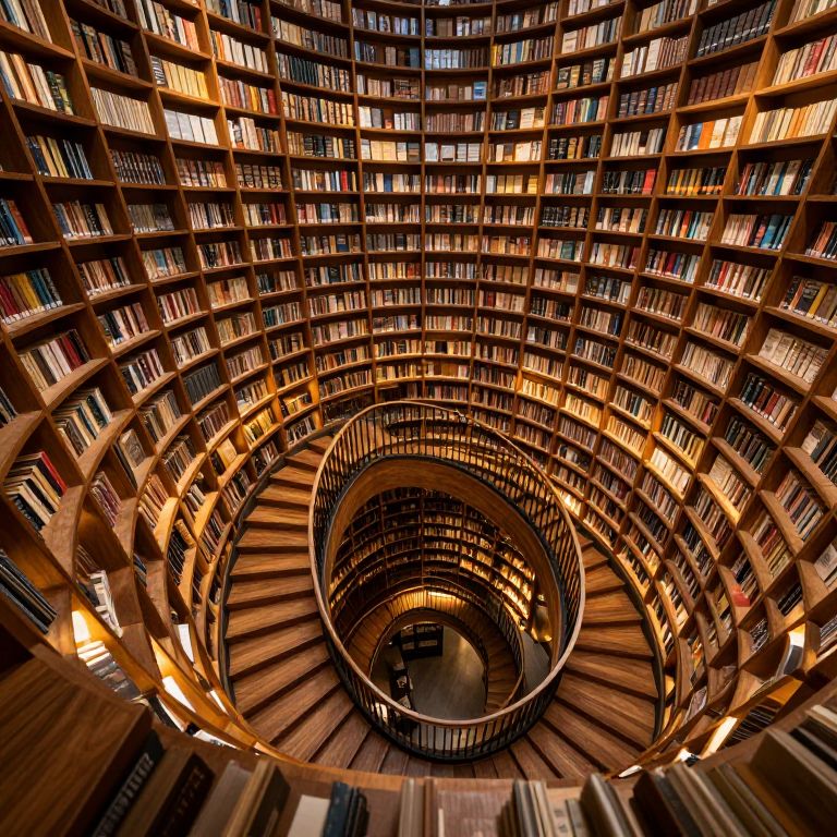 Photograph of a grand, circular library with towering, wooden bookshelves spiraling upward and inward, creating a mesmerizing, spiral staircase effect. The shelves are densely packed with books of various sizes and colors, illuminated by warm, golden lights. The wooden texture of the shelves and railings adds a rich, inviting feel, contrasting with the dark, shadowy spaces between the shelves. The image captures the library's immense scale and architectural beauty from a downward perspective, emphasizing the intricate, almost hypnotic pattern of the spiral design.