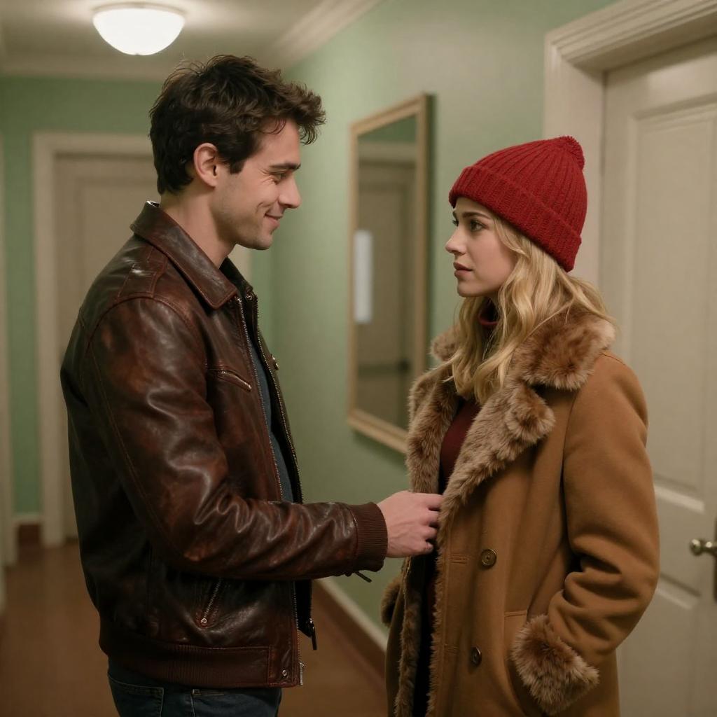 Photograph of a man and woman in a hallway. Man, with short dark hair and leather jacket, touches woman's arm. Woman, with blonde hair, red knit hat, brown coat with fur trim, looks at man. Hallway has green walls, mirror, and door. Man smiles, woman has neutral expression.