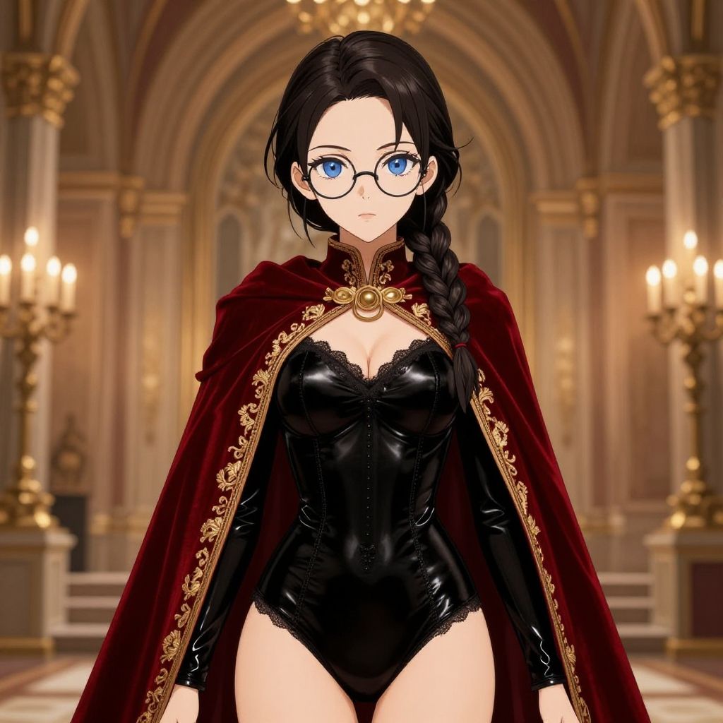 Anime-style illustration of a young woman with dark braided hair and blue eyes wearing round glasses. She is dressed in a black shiny bodysuit with lace details and a red velvet cloak with gold embroidery. The background features a grand, classical interior with ornate arches and lit candelabras, giving a medieval or royal atmosphere.