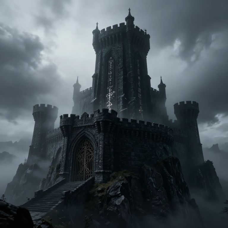 Beautiful dark fantasy castle with black stone walls and glowing runes, perched atop a craggy mountain, shrouded in thick fog and swirling shadows, with looming towers and intricate ironwork gates, moody atmosphere, epic fantasy landscape.