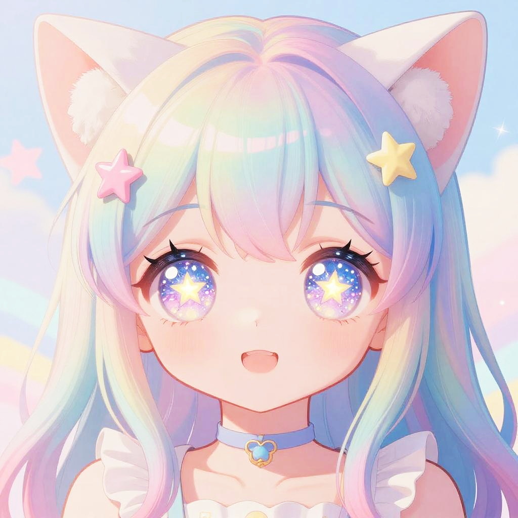 Kawaii catgirl with oversized sparkling eyes and pastel rainbow hair with tiny star clips, soft colors, and dreamy atmosphere,