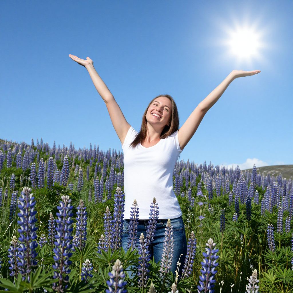 Happy, Kodiak, Island, Alaska, lupine, wildflowers, blue sky, sun, sunshine, woman, flowers, summer