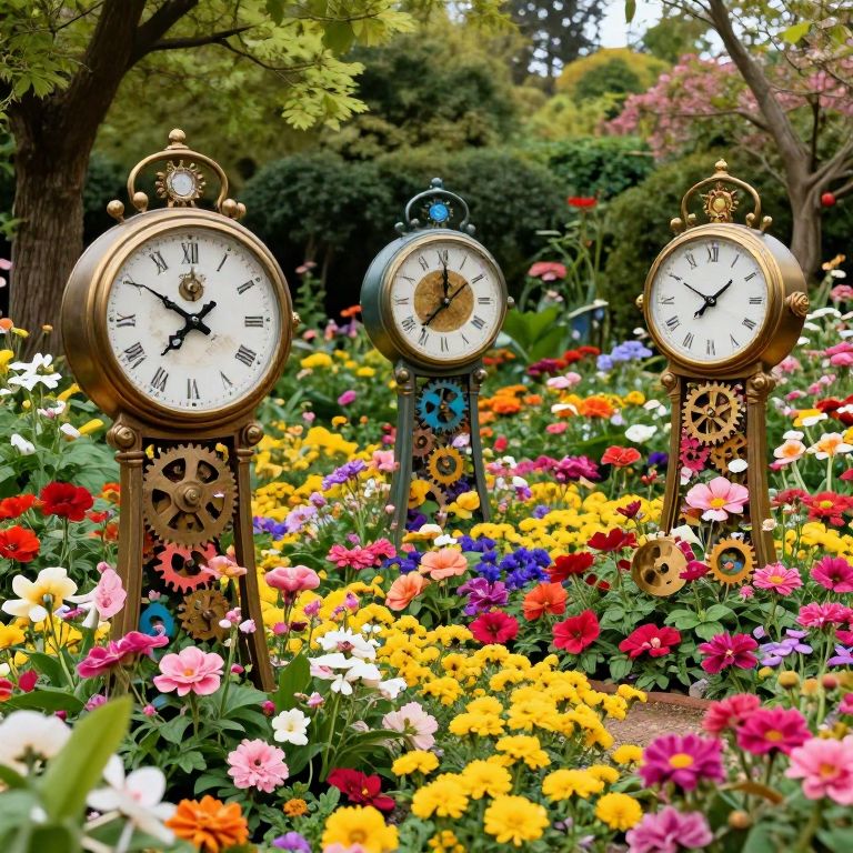 In a whimsical garden where time and nature intertwine, vintage clocks stand tall among vibrant blooms, their gears and dials seamlessly merging with the petals and leaves, creating a surreal landscape where the passage of time blossoms into life.