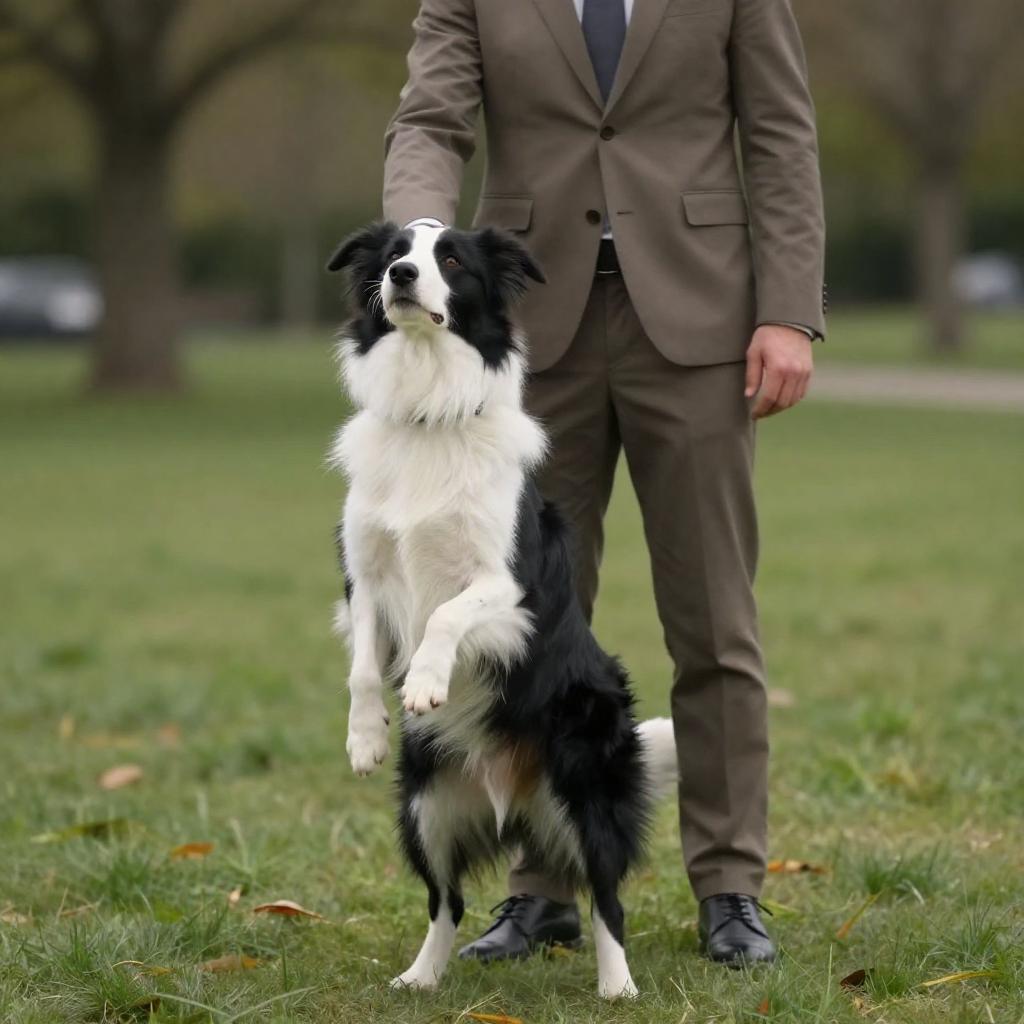 Photograph of a man in a brown suit and black shoes standing in a grassy park, holding the head of a large, white and black Border Collie with one hand. The dog stands on its hind legs, looking up at the man. Trees and a blurred background are visible.