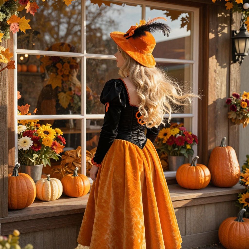 A woman with long, flowing blonde hair stands in front of a large window, gazing out at a festive autumn display filled with pumpkins and vibrant flowers. She wears a detailed black and orange costume featuring a sleek corset, a full-length orange velvet dress, and a bright orange velvet hat with a decorative feather. The setting is warm and inviting, with golden afternoon sunlight streaming through the window, casting soft shadows and highlighting the textures of her costume and the seasonal decorations. The background shows a cozy, rustic interior with autumnal colors, enhancing the festive atmosphere.