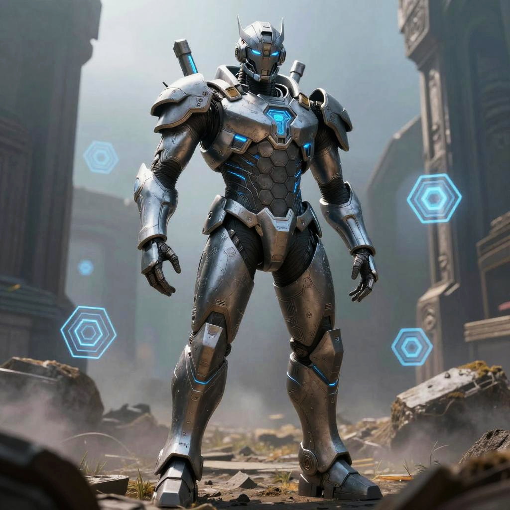 Hexagon warrior standing tall in a futuristic battle armor made of interlocking hexagonal plates, glowing blue energy veins, in a misty battlefield with ancient ruins and floating hexagonal motifs, dramatic lighting and cinematic atmosphere.