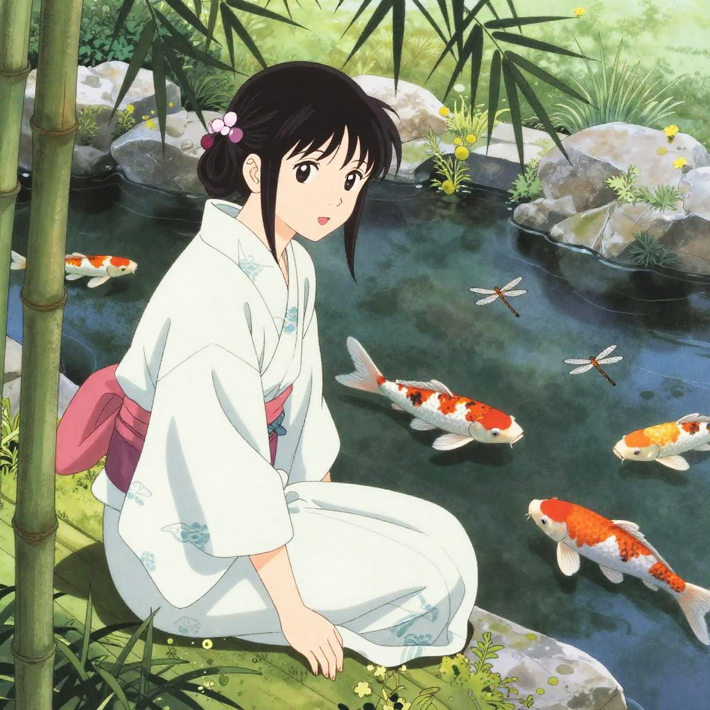 A graceful koi pond watcher, wearing a delicate light summer yukata, sitting in a bamboo garden by a koi-filled pond, surrounded by swimming fish and fluttering dragonflies, illustrated in the nostalgic and atmospheric manga style of Tadao Tsuge.