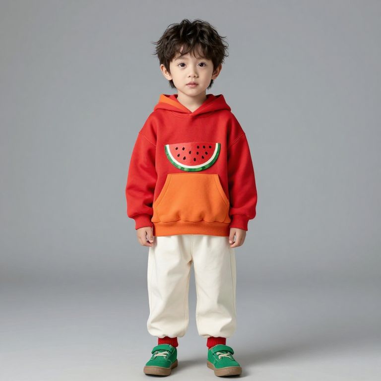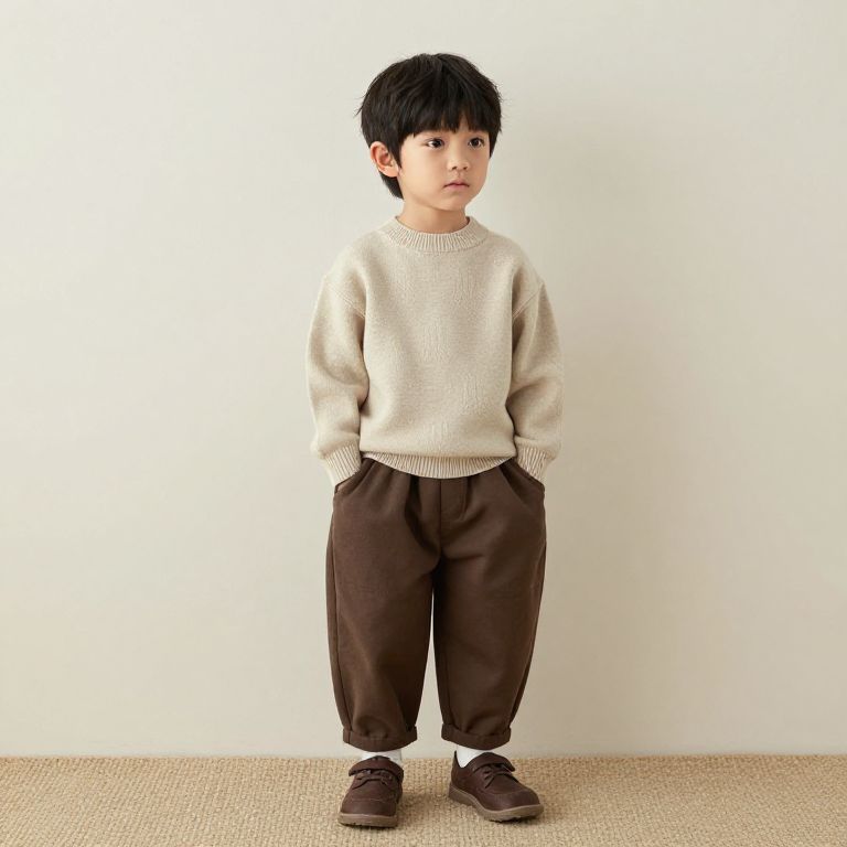 Boy in Beige Sweater and Brown Pants