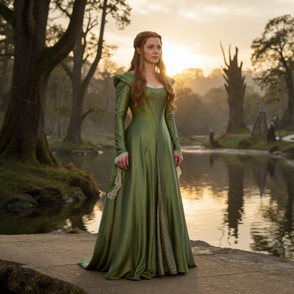 Arwen in a high-quality costume scene from The Lord of the Rings, dressed in a flowing green silk dress with lace details, standing on a stone bridge overlooking a calm lake under a golden sunrise, her face serene and beautiful with soft light catching her features, surrounded by tall elves and trees in a peaceful enchanted woodland