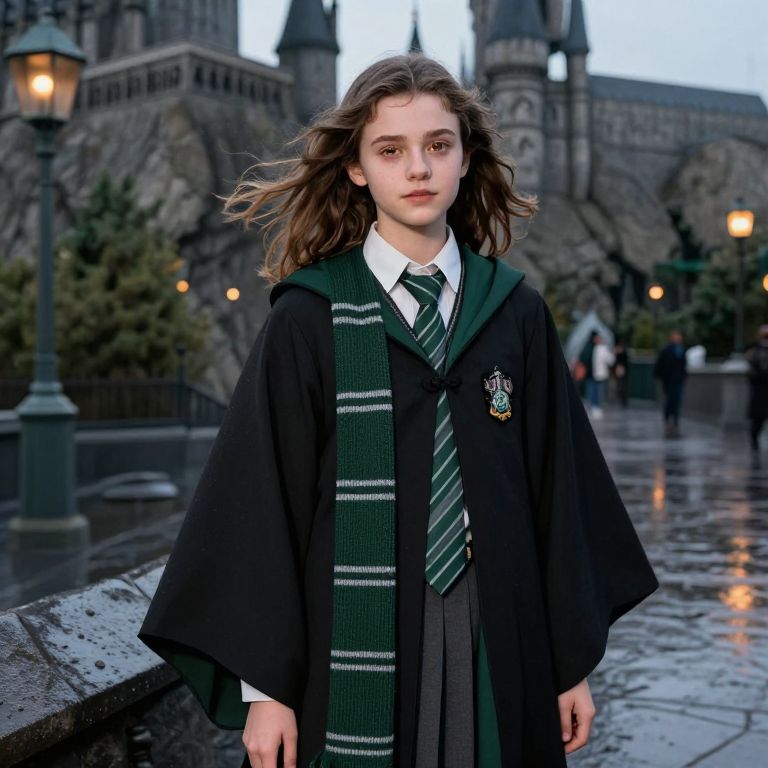 A teenage girl with high cheekbones and warm amber eyes in a beautifully tailored Slytherin robe, standing on the edge of a rain-slicked Hogwarts courtyard at dusk, the wind gently lifting the sleeves of her robe, realistic, natural lighting, detailed fabric texture