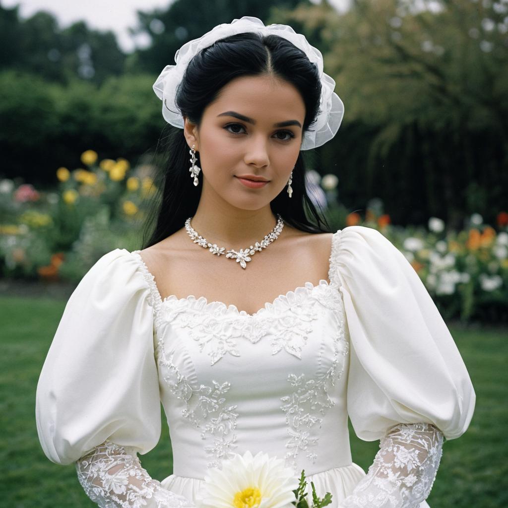 Woman in Long White Dress with Puffy Sleeves Outdoors