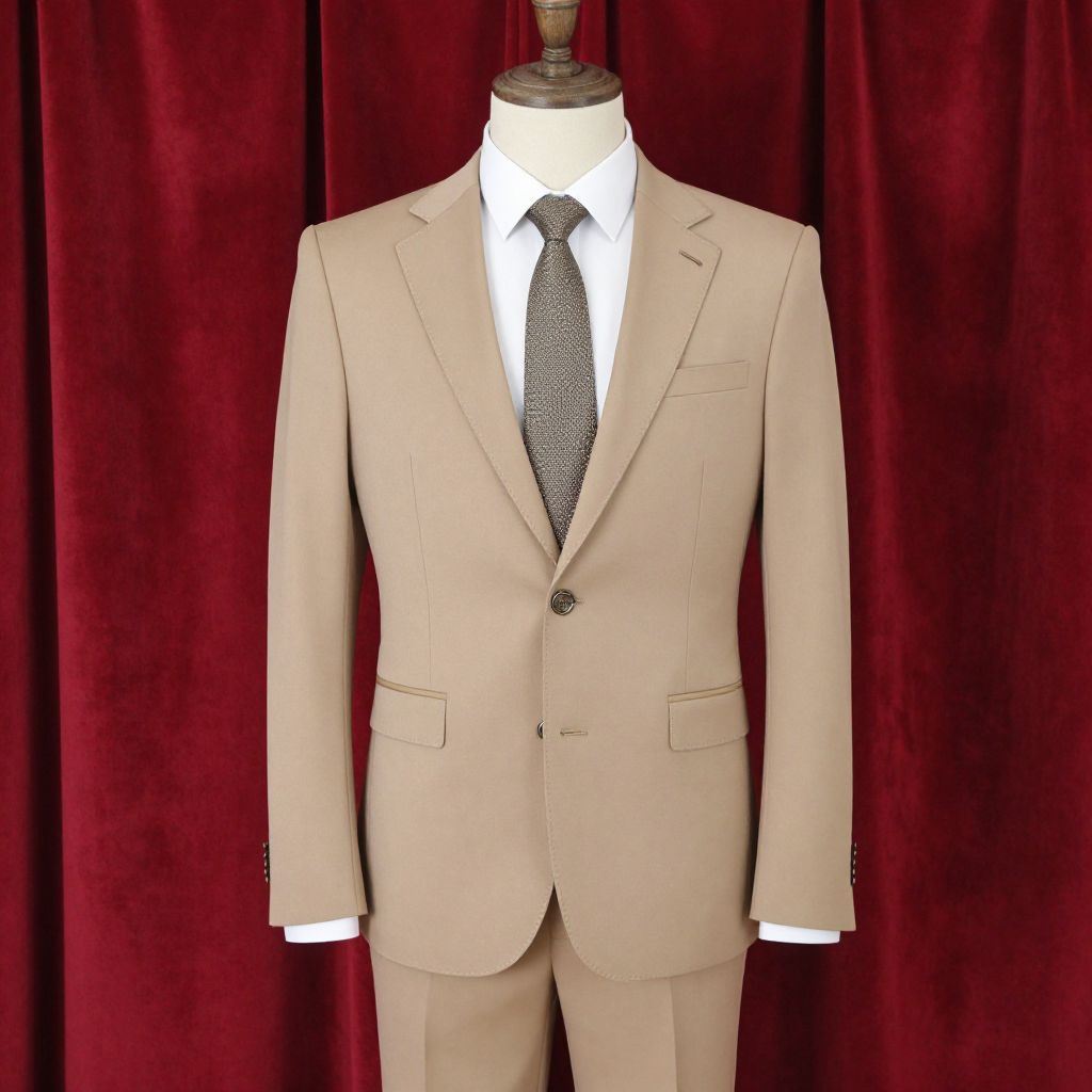 Photograph of a beige, tailored men's suit displayed on a mannequin against a rich, red velvet curtain background. The suit includes a single-breasted, notched-lapel blazer with a buttoned closure, a white dress shirt, and a black, patterned tie. The blazer has two flap pockets. The mannequin's head is absent, focusing attention on the suit. The texture of the velvet curtain contrasts with the smooth fabric of the suit. The overall style is formal and elegant, emphasizing classic menswear fashion.