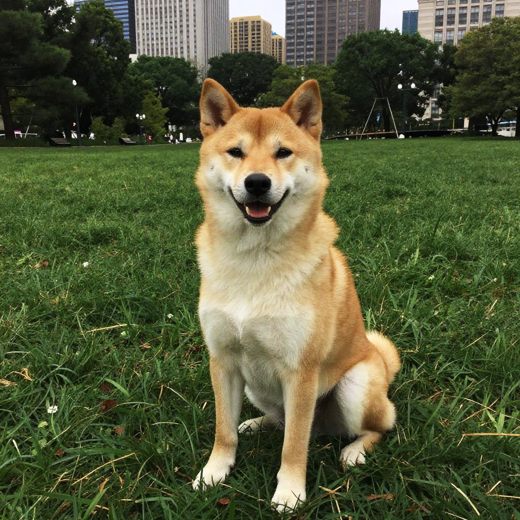 Ohtani dog breed in an urban park setting, sitting alert on green grass with city skyline in distance, harmonious blend of natural and modern environment, rich color palette with realistic lighting and shadowing