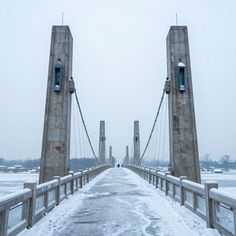 Photograph of a snow-covered suspension bridge with two tall, rectangular stone towers on either side. The bridge's walkway is icy with snow patches, and cables connect the towers. In the background, a foggy, wintry landscape is visible with distant trees and a few indistinct buildings. The bridge's railings are lined with snow, and the sky is overcast, casting a cold, grayish-white light over the scene. Two small figures walk away in the distance, adding a sense of scale. The overall mood is serene and chilly.