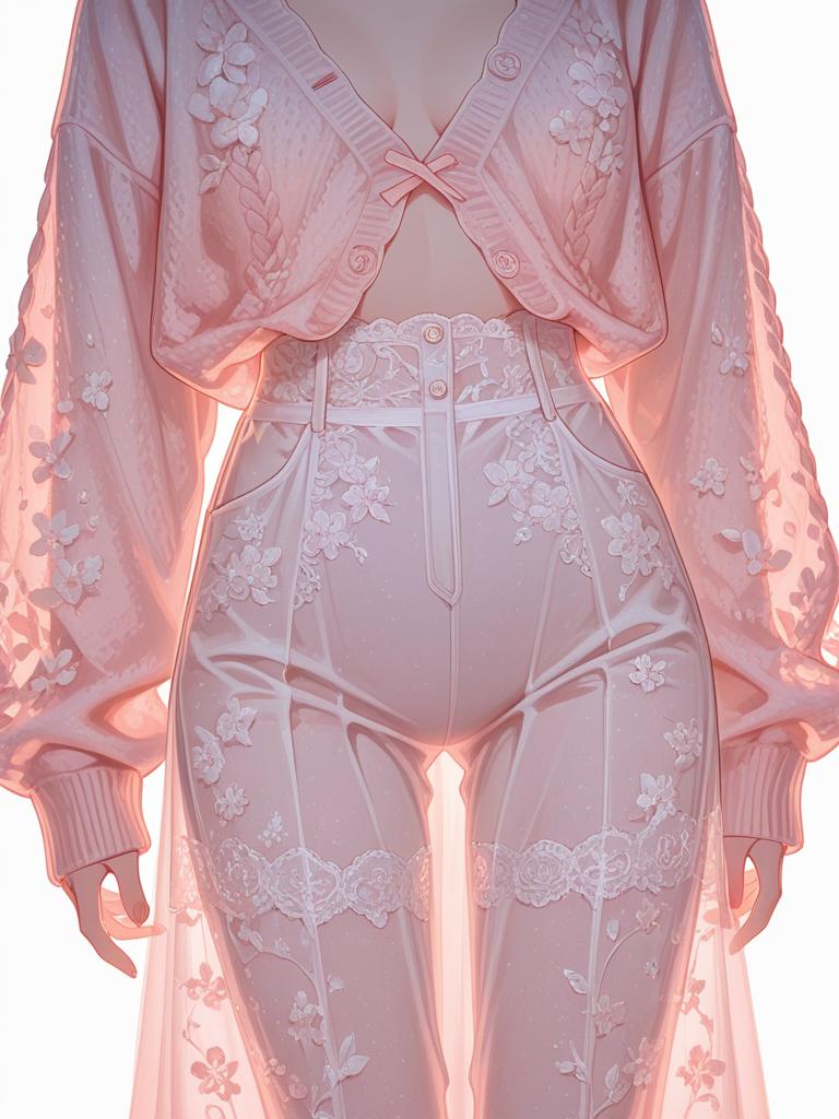 Sheer mesh cardigan, lightweight fabric, soft pastel pink, open front design, long sleeves, delicate lace trim, matching mesh pants, high-waisted, flowing silhouette, sheer panels, subtle floral embroidery, comfortable fit, perfect for layering.