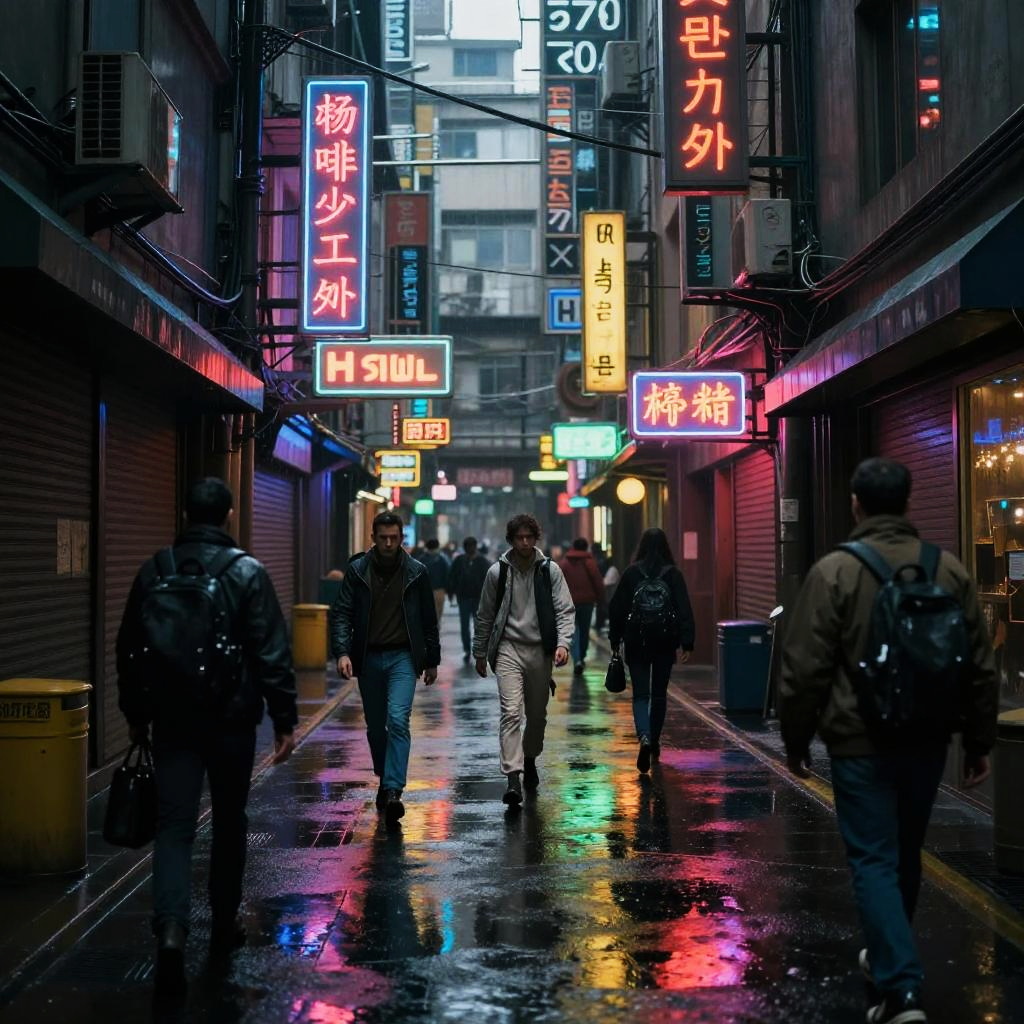 Cac inspired cyberpunk alleyway, neon signs in various scripts, rain-soaked streets reflecting colorful lights, gritty urban environment, diverse crowd of futuristic characters, high contrast lighting, wide angle perspective, cinematic mood