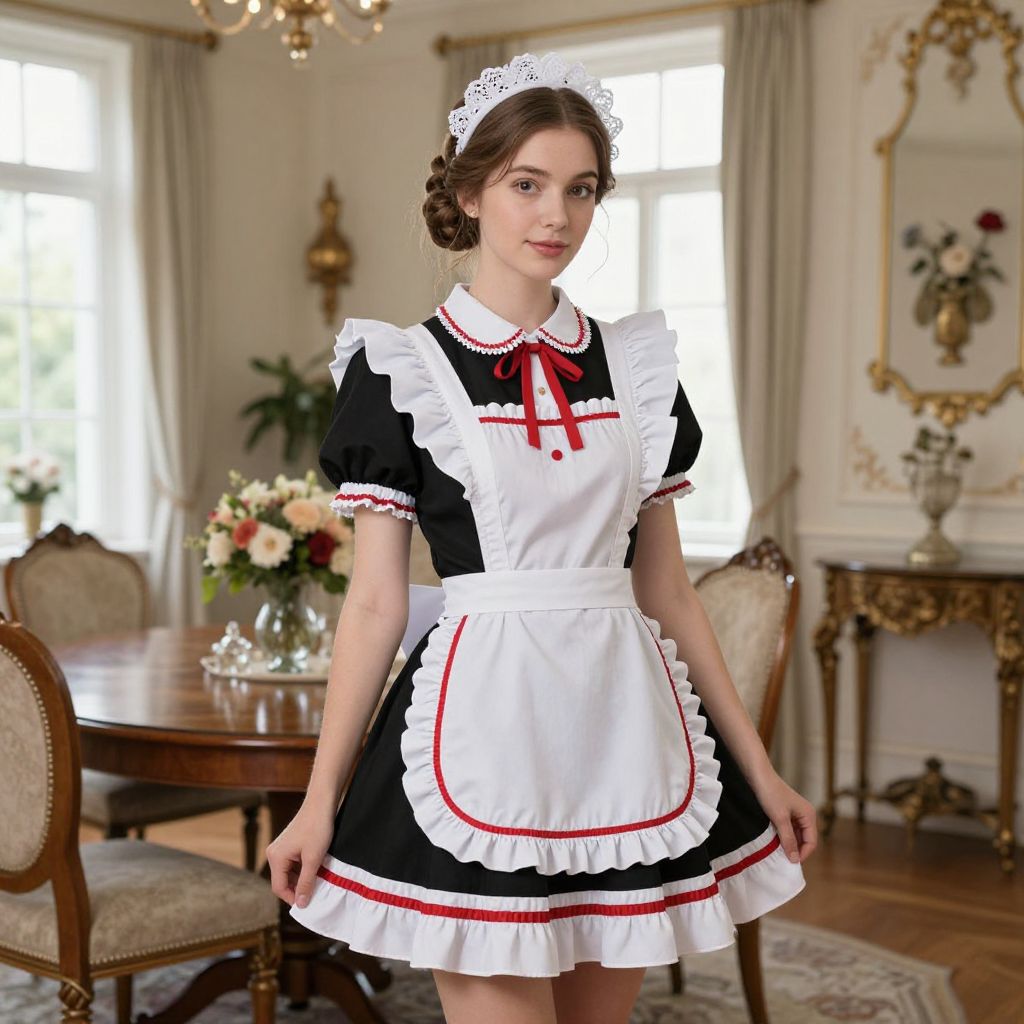 Photograph of a young woman in a black and white French maid outfit with red accents, standing in a bright, elegant dining room.