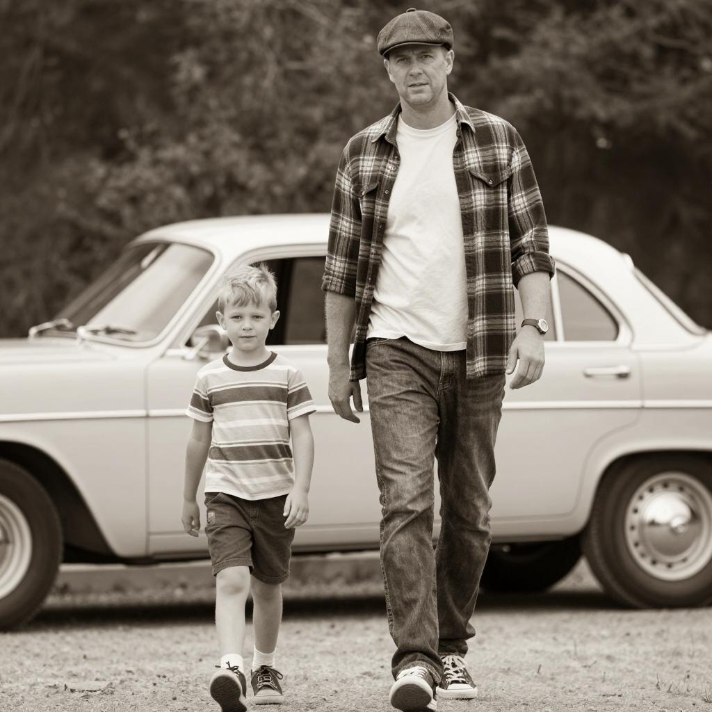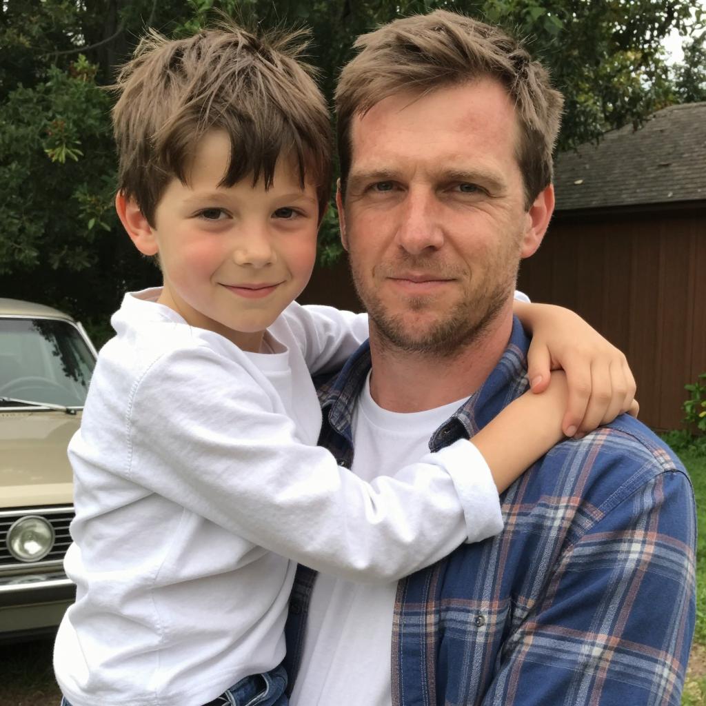 A photograph of a man with short brown hair and a cigarette in his mouth, wearing a white t-shirt and blue plaid shirt, standing in front of a car. A young boy with short brown hair, wearing a white long-sleeve shirt and blue plaid shirt, hugs him from behind. The man has a slightly tired expression, and the boy smiles. Green trees and a wooden fence are in the background. The man has his right hand resting on the car. The boy's arms are around the man's neck. Two people.
