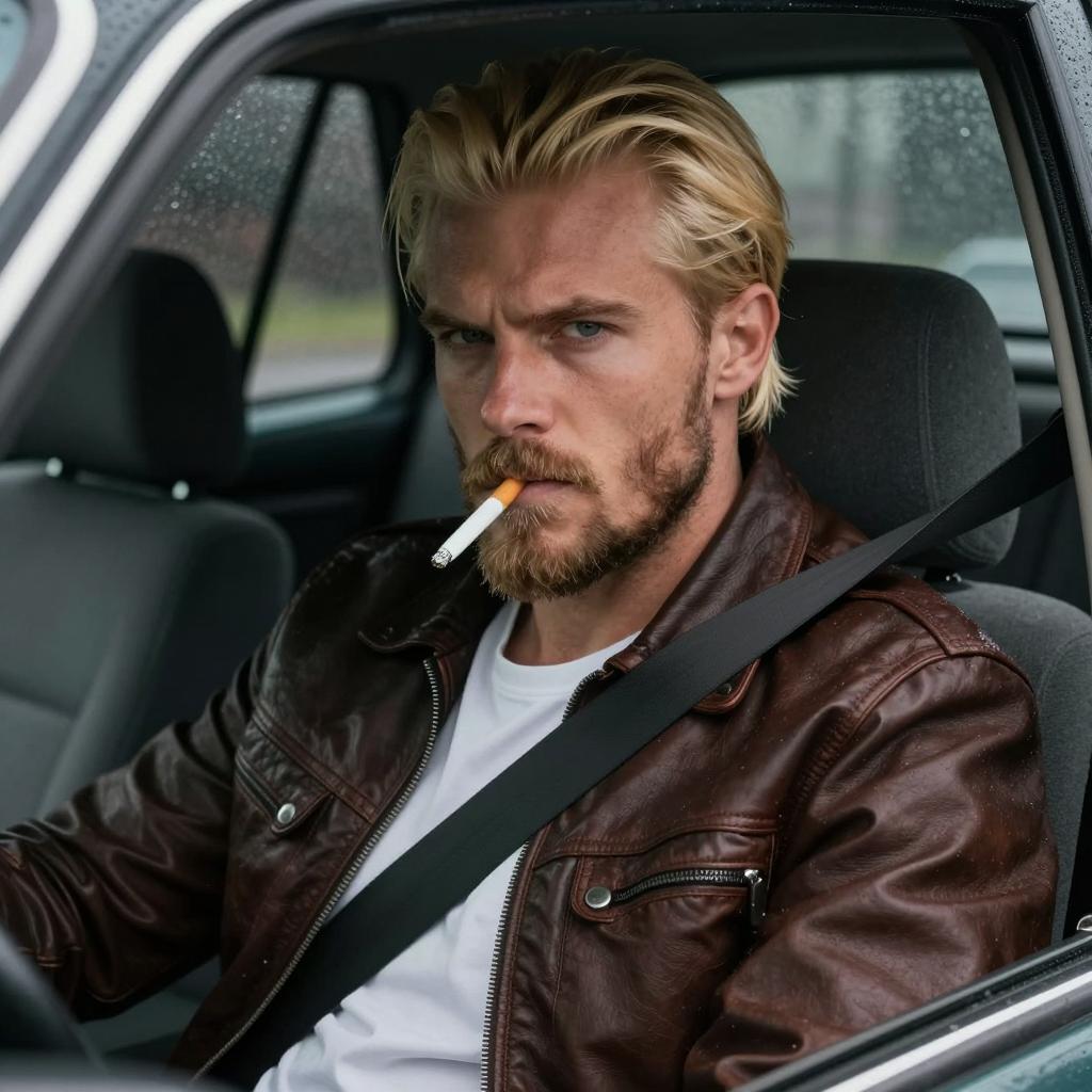 A man with short brown hair and a cigarette in his mouth wearing a white t-shirt and blue plaid shirt stands outdoors in front of a white car. A young boy with short brown hair, wearing a white long-sleeve shirt, hugs the man from behind, smiling. The man shows a slightly tired expression with his right arm resting on the car. Background includes green trees and a wooden fence.