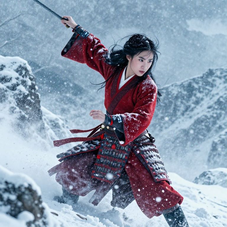 Mulan avalanche scene, a fierce warrior standing on a snowy mountain slope, traditional Chinese armor dusted with snow, swirling avalanche in the background, dynamic motion captured, cold icy blue tones contrasting with warm red accents, cinematic lighting, dramatic atmosphere