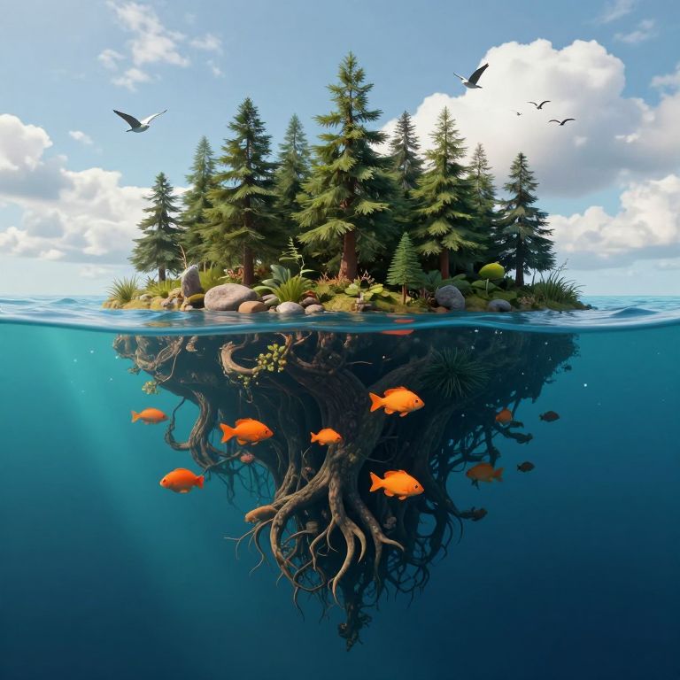 This digital CGI image depicts a small, island-like landmass covered with dense, green pine trees, surrounded by clear blue water under a bright, partly cloudy sky. Above water, several black birds fly. Below water, vibrant orange fish swim around the island's exposed, gnarled roots. The island features a mix of rocks, grasses, and small plants. Light rays penetrate the water, illuminating the underwater scene. The image combines a realistic style with a whimsical touch, highlighting the contrast between the underwater and above-water environments.