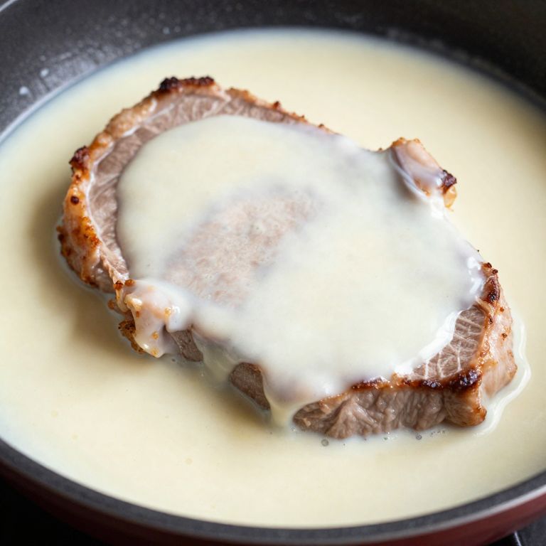Photograph of a single slice of browned, medium-rare roasted pork, topped with a generous amount of creamy white sauce, floating in a shallow, black skillet filled with the same creamy sauce. The pork slice has a crispy, caramelized edge, with slightly pink, juicy meat visible in the center. The creamy sauce covers most of the pork, creating a smooth, glossy texture. The background is slightly blurred, focusing attention on the pork and sauce. The image has a high contrast, emphasizing the textures and colors of the meat and sauce.