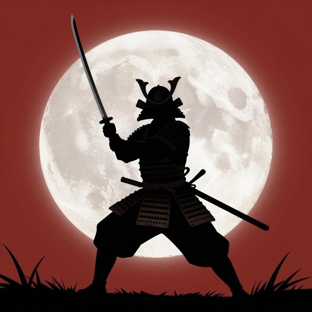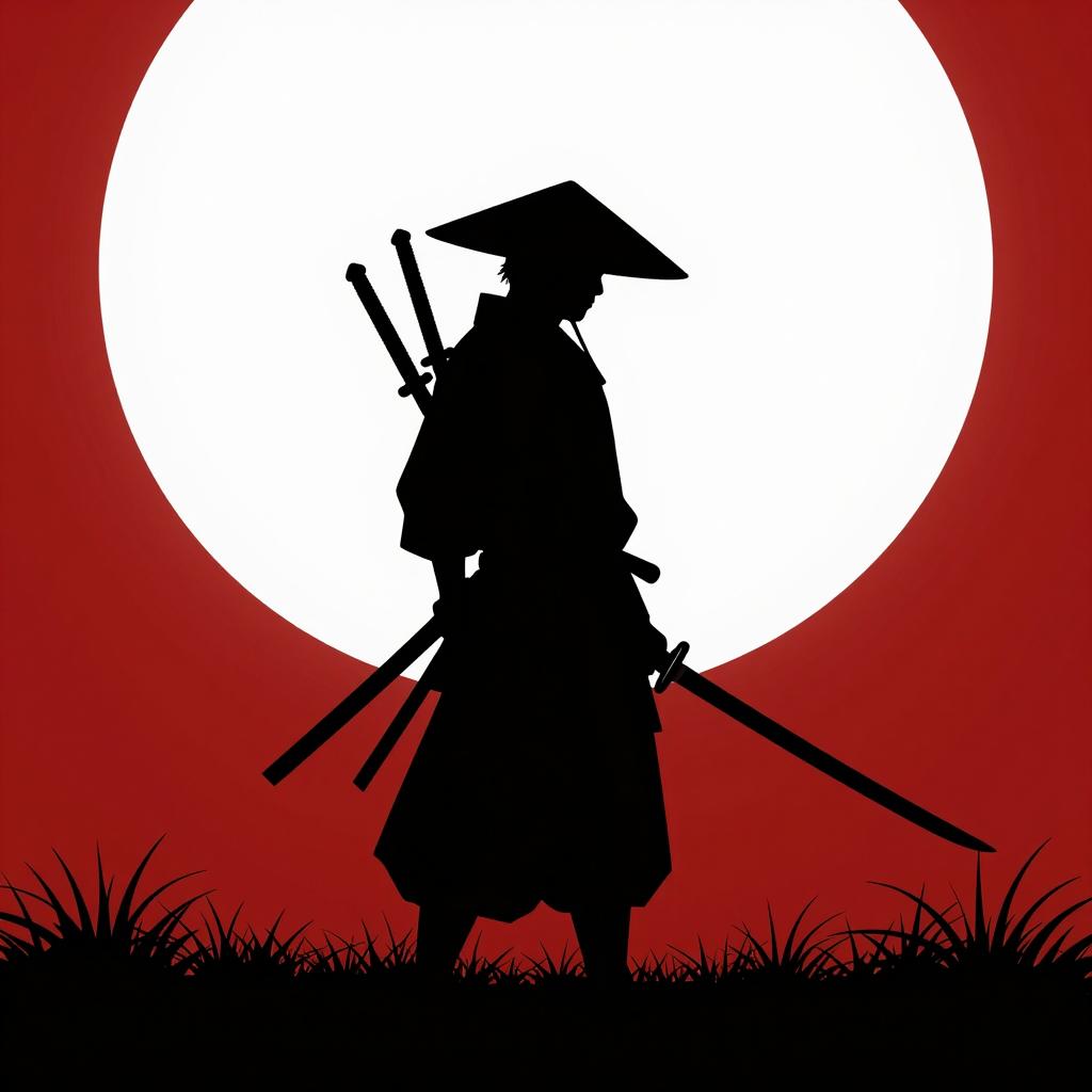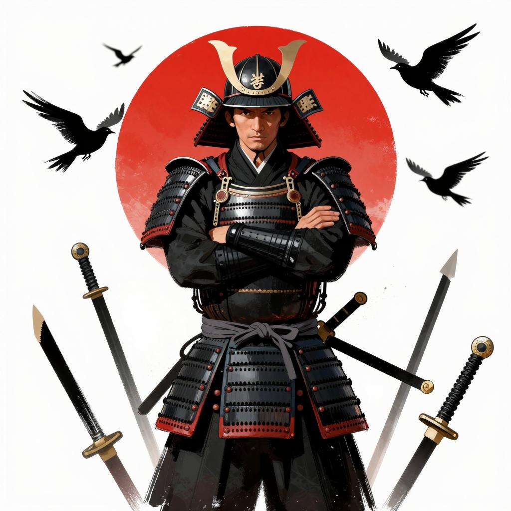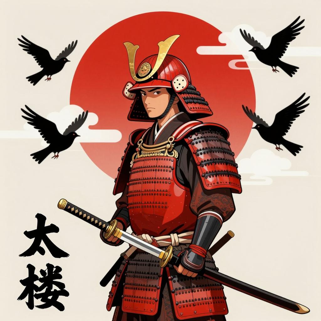 Illustration of two Japanese swords with black handles, one larger and one smaller, standing vertically. A large red circle with bloodstains overlaps the swords. Two black birds fly above the circle. The background is a plain, light grey. The swords have a slight sheen.