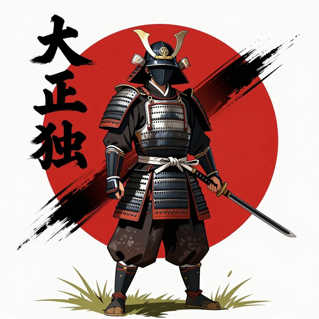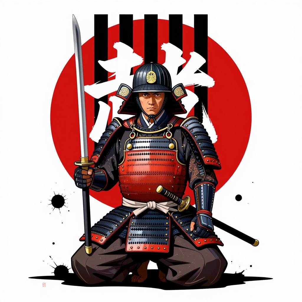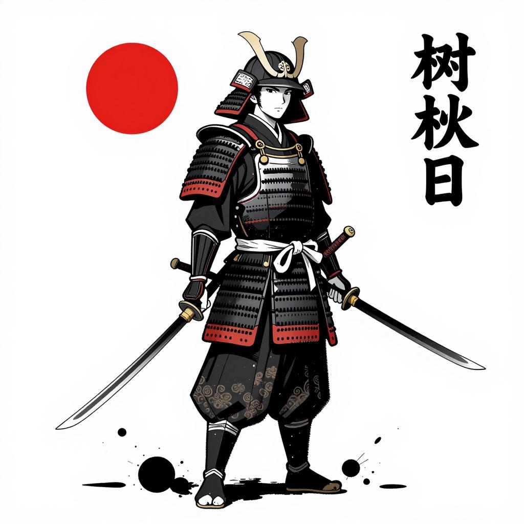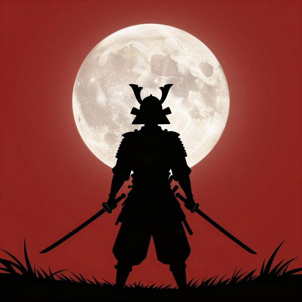 Illustration of two Japanese swords with black handles, one larger and one smaller, standing vertically. A large red circle with bloodstains overlaps the swords. Two black birds fly above the circle. The background is a plain, light grey. The swords have a slight sheen.