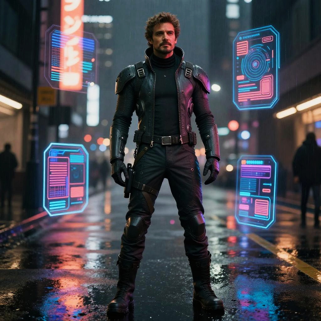 Pedro Pascal full body in futuristic cyberpunk attire, rainy street at night, glowing holograms, vibrant colors, intricate costume design, moody atmosphere