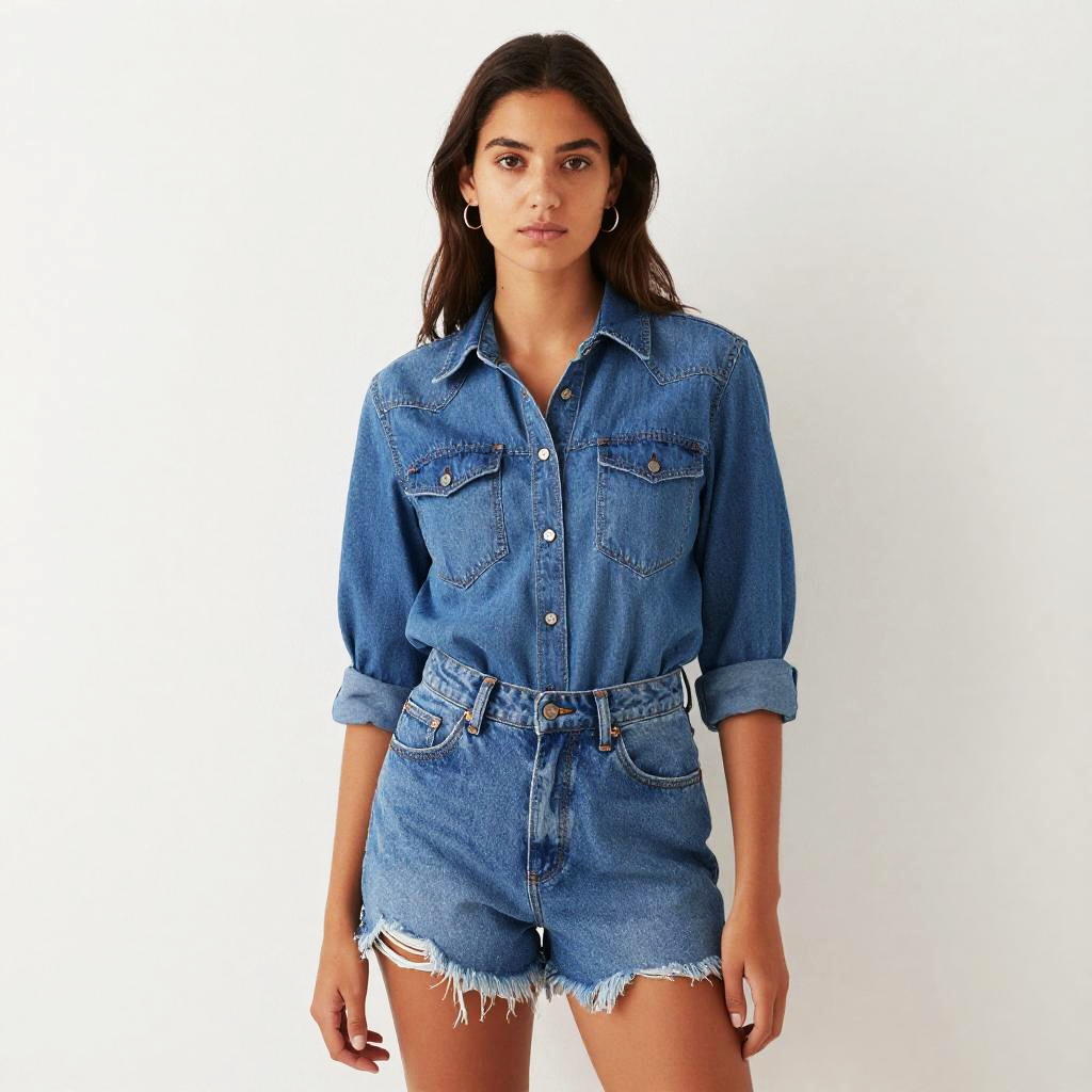 A stylish woman leans against a textured wall, exuding confidence in a trendy denim shirt paired with distressed denim shorts. Her relaxed pose and natural expression create a casual, yet chic aesthetic, perfect for fashion-forward editorial content.