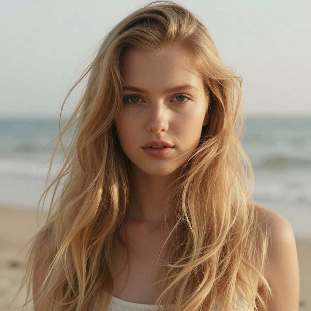 A stunning portrait of a young woman with long, flowing blonde hair, captured against a serene beach backdrop. The soft focus and warm sunlight create an ethereal quality, making this image perfect for conveying beauty and tranquility.