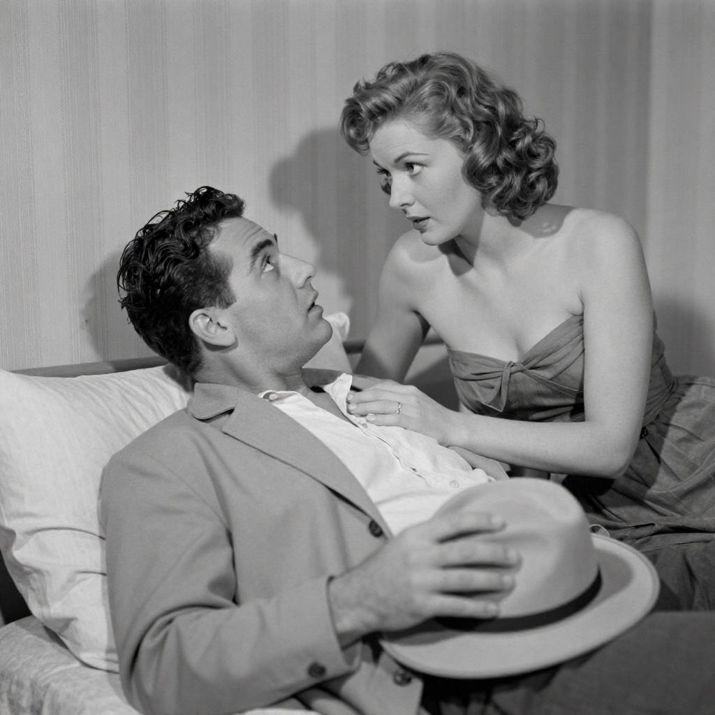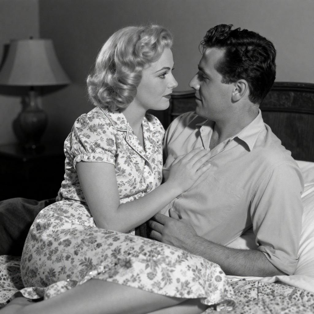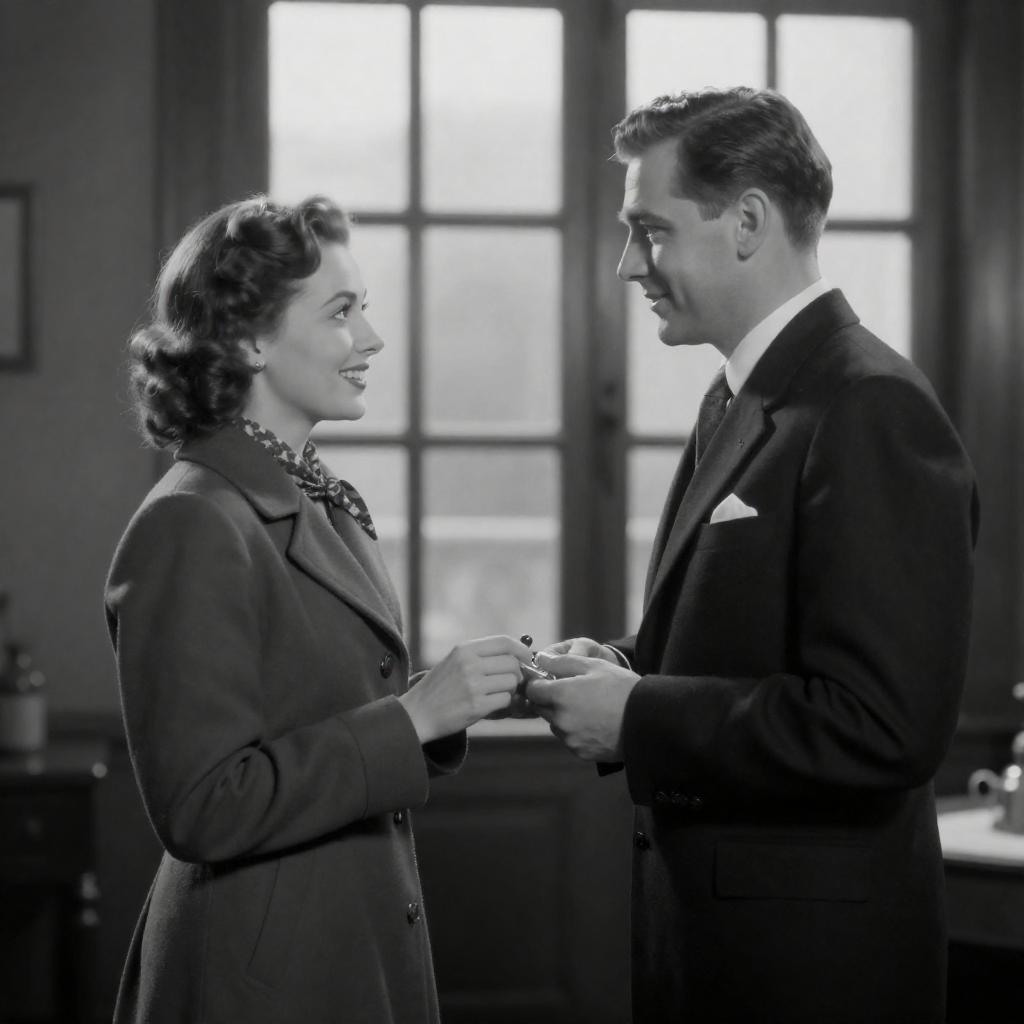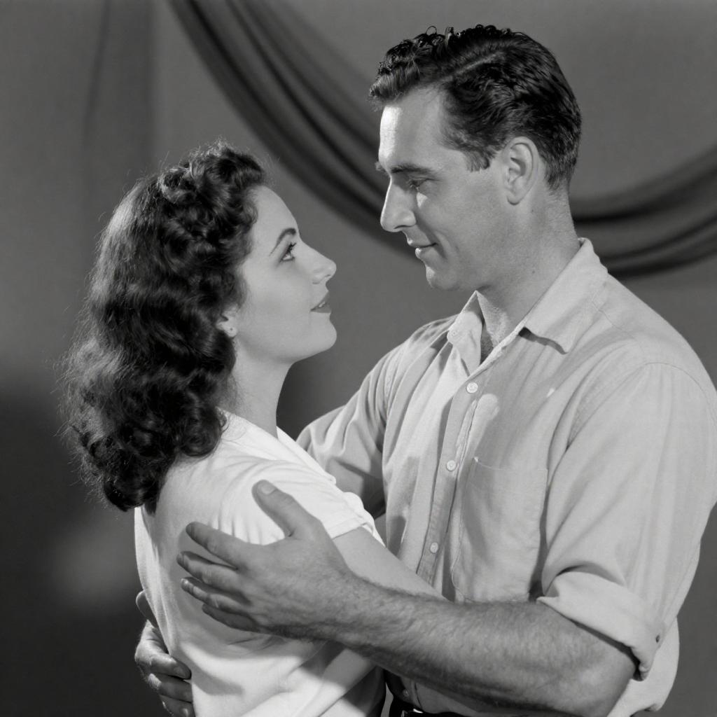 Black-and-white photograph of a 1940s-style couple in a car. The woman, with wavy hair and a dark dress, gazes at the man, who has short, dark hair and wears a suit. She touches his face gently. The car's interior is dimly lit, with shadows creating a romantic atmosphere.