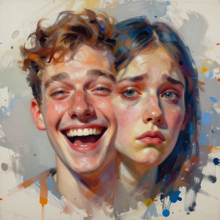 Change your face artwork, dual-faced person with one side joyous and other side sorrowful, expressive eyes, painterly brush strokes, abstract splashes of paint background, emotional depth, warm and cool color blend, artistic style