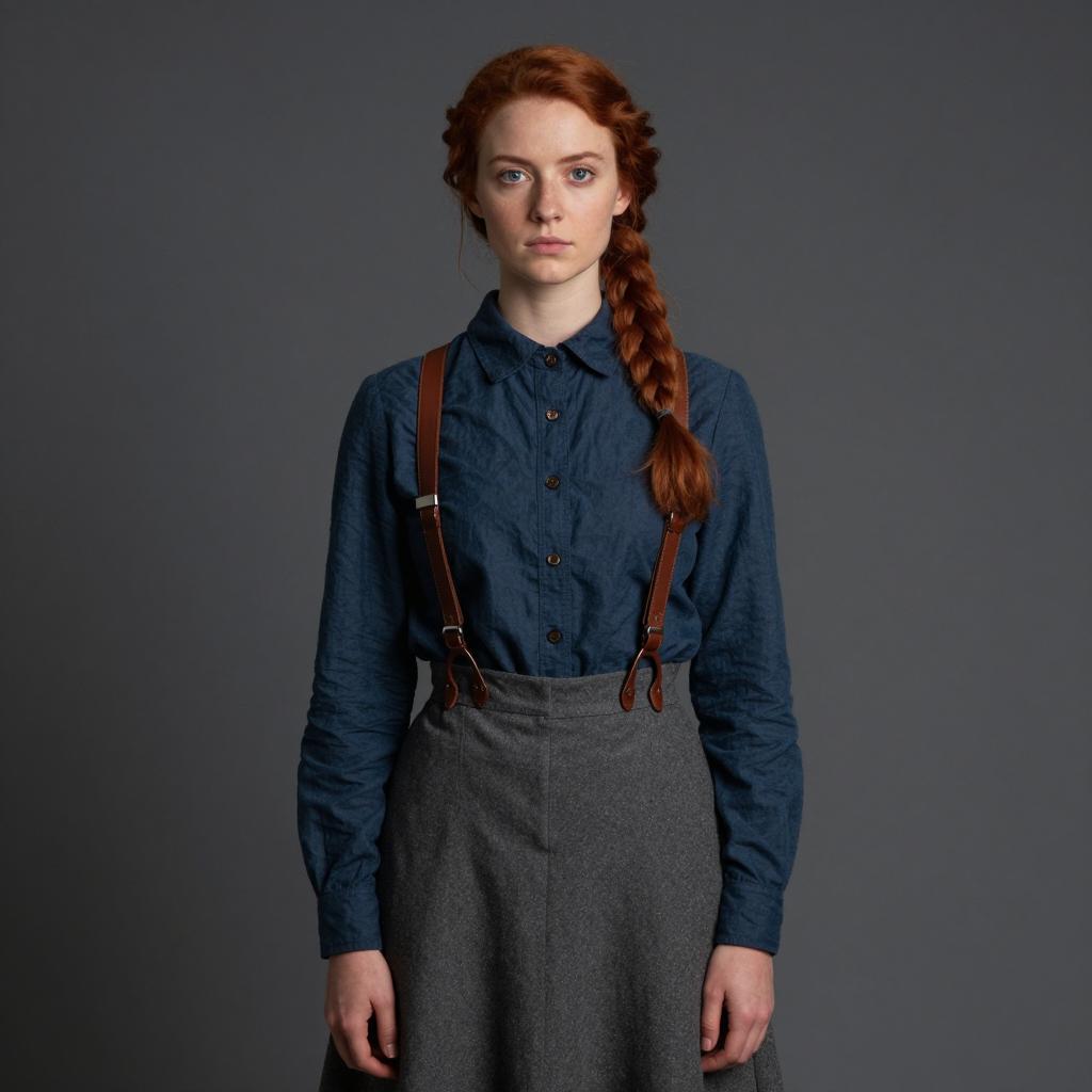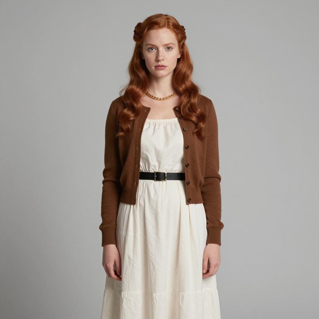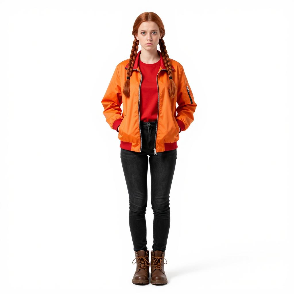 Silly sally costume, photorealistic, young woman, standing, full body, white background, orange and red jacket, red shirt, black skinny jeans, brown boots, hands in pockets, long auburn braided pigtails, serious expression, studio lighting, casual outfit, full length, front view