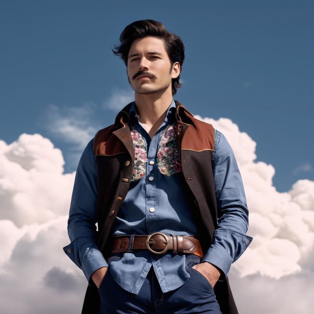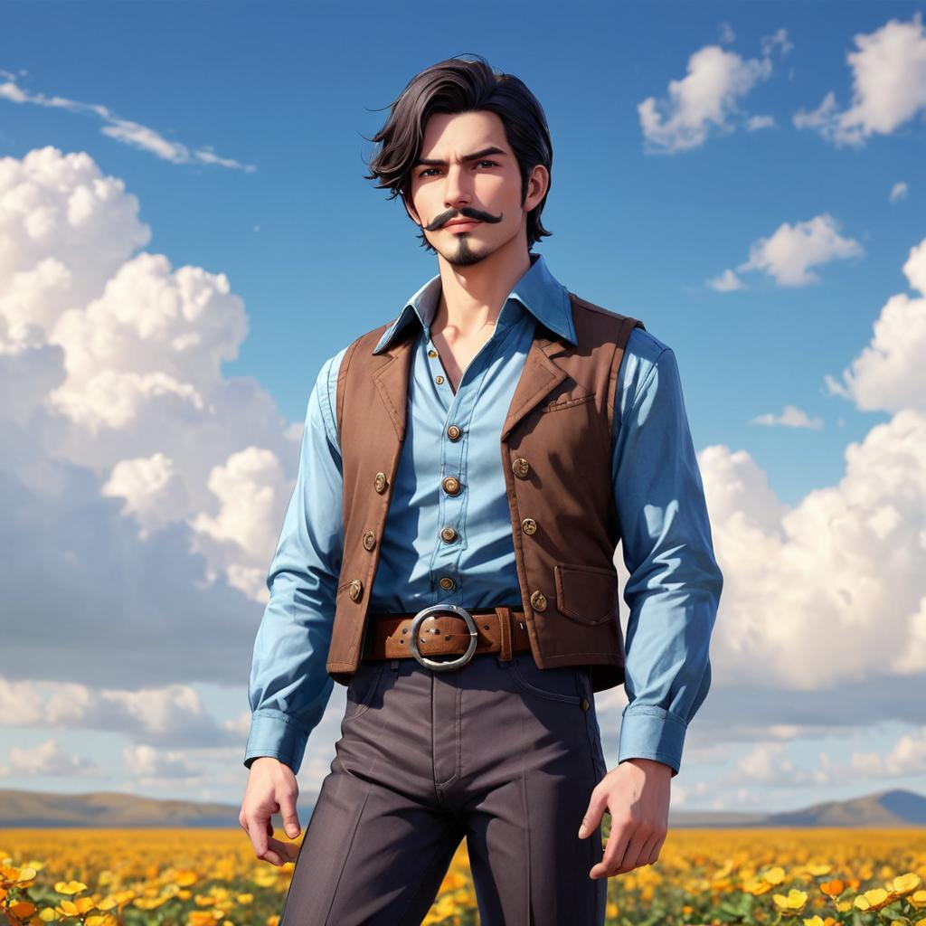 Portrait of a man with a distinctive mustache standing outdoors against a cloudy blue sky. He is wearing a light blue denim shirt paired with a dark brown vest and navy pants. The man also sports a decorative leather belt with a large ornate buckle, hands casually in pockets. In the background, there are distant mountains and open landscape.