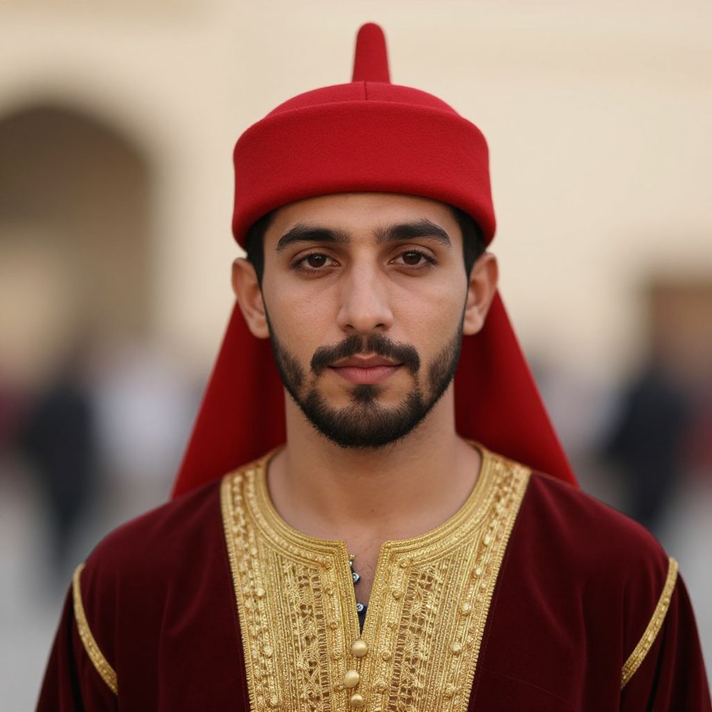 Photograph of a young Middle Eastern man with olive skin, dark eyes, and a short beard, wearing a red fez hat and a rich maroon robe adorned with intricate gold embroidery. His expression is calm and slightly serious. The background is blurred, showing indistinct figures and a bright, sunlit outdoor setting. The man's robe has a high, pointed collar with detailed gold patterns, and the red fez sits prominently on his head. The overall image has a warm, natural light and a shallow depth of field, focusing sharply on the man's face and attire.
