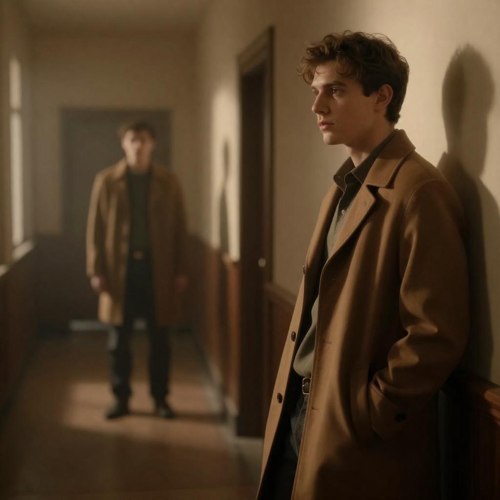 Photograph of a young man with short brown hair, wearing a dark brown suit and black tie, shouting with an open mouth. He stands amidst a smoky, dimly lit background with people in hats and coats. A streetlamp is visible on the left. The image has a dramatic, intense atmosphere.