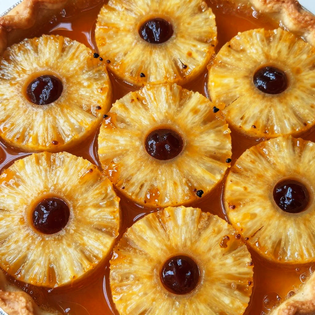 Close-up image of a golden-brown pineapple pie featuring caramelized circular pineapple slices with dark glossy centers resembling cherries. The pie displays a sticky, gooey caramelized sugar texture with warm yellow and brown tones.