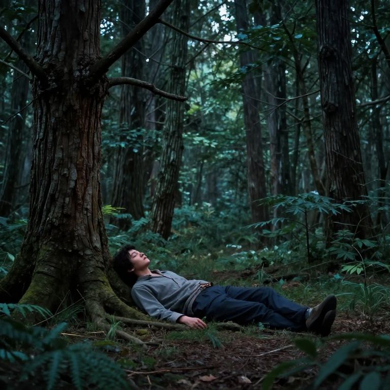 Photograph of a young Asian man with short black hair, wearing a gray long-sleeve shirt and dark pants, reclining against a tree in a dense, dark forest. His eyes are closed, and he has a relaxed expression. The forest is filled with tall trees, green foliage, and a dim, blue-tinted light filtering through the canopy. The ground is covered in moss and small plants. His right arm rests on his chest, and his legs are stretched out. The overall mood is serene and contemplative.