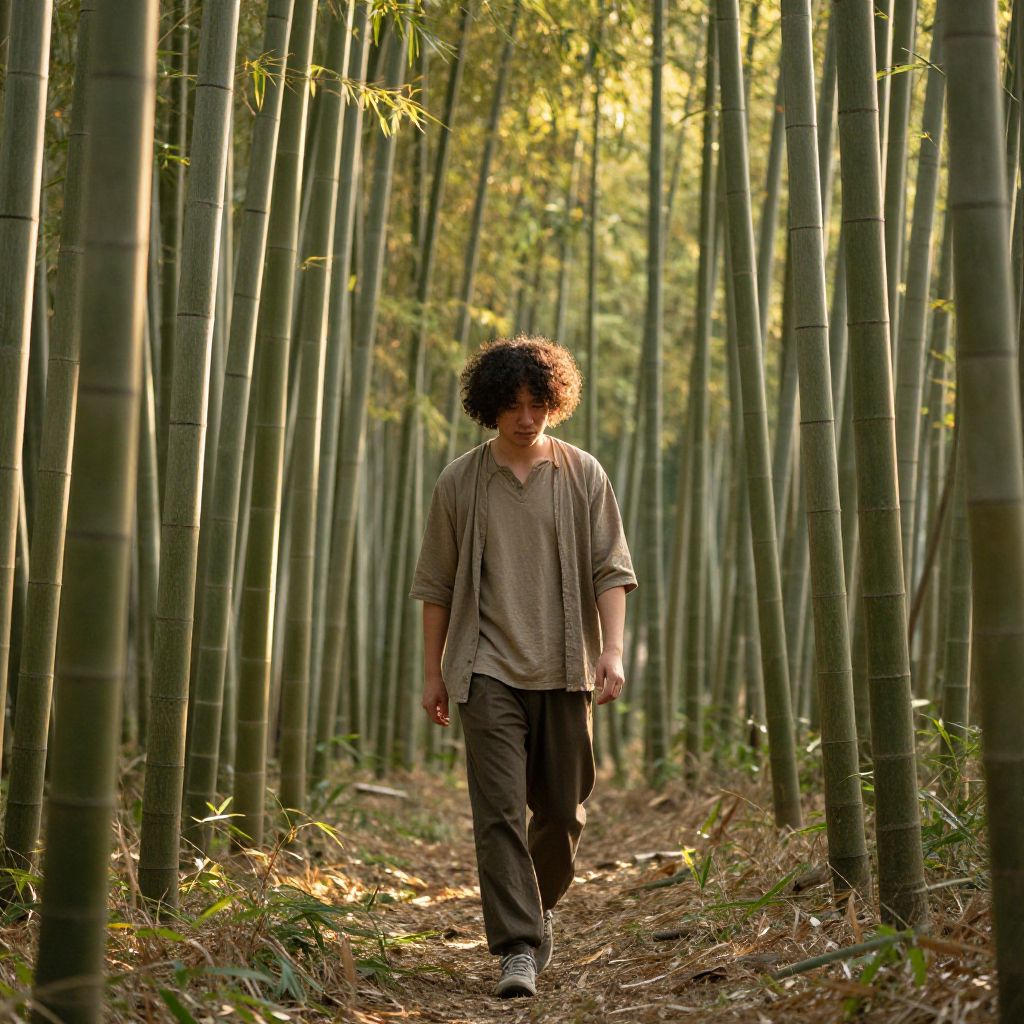 Photograph of an Asian man with short black hair, wearing a gray shirt and black pants, lying on forest floor, leaning against a tree, surrounded