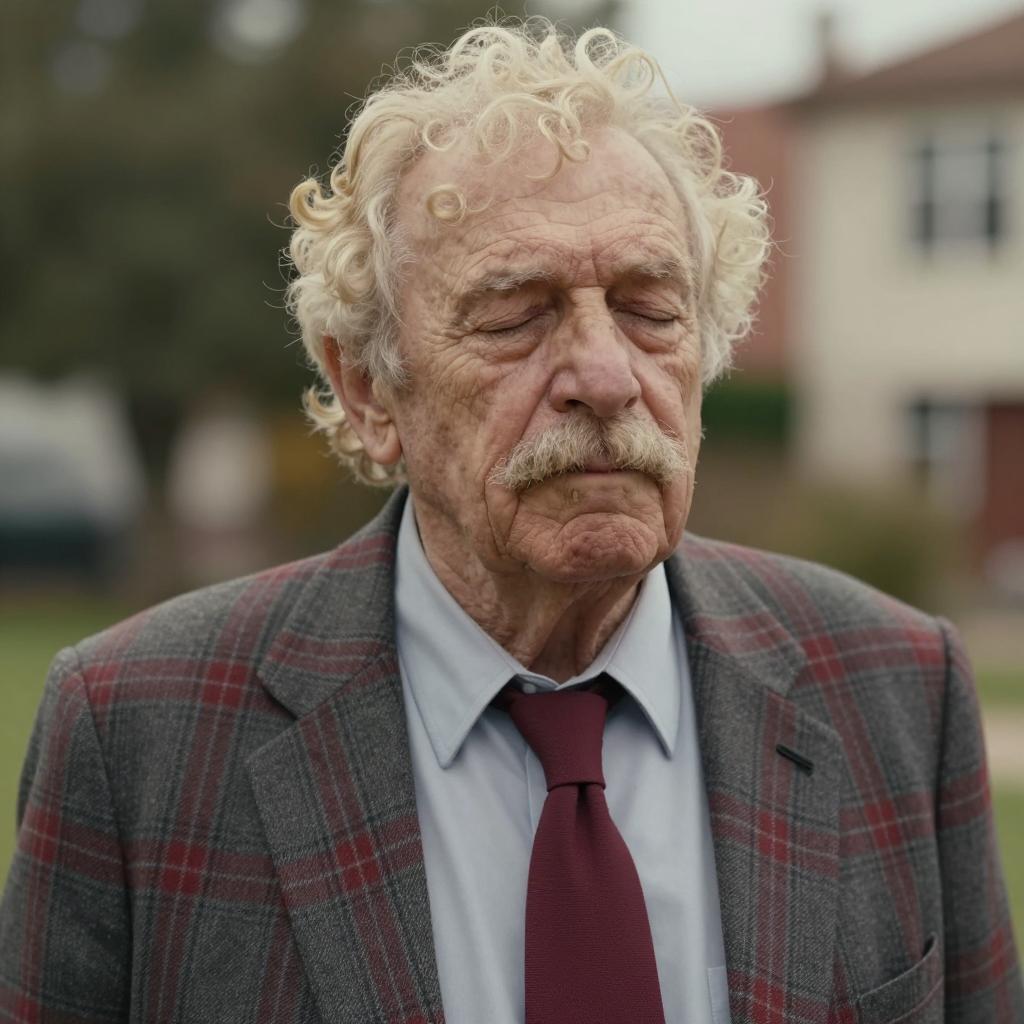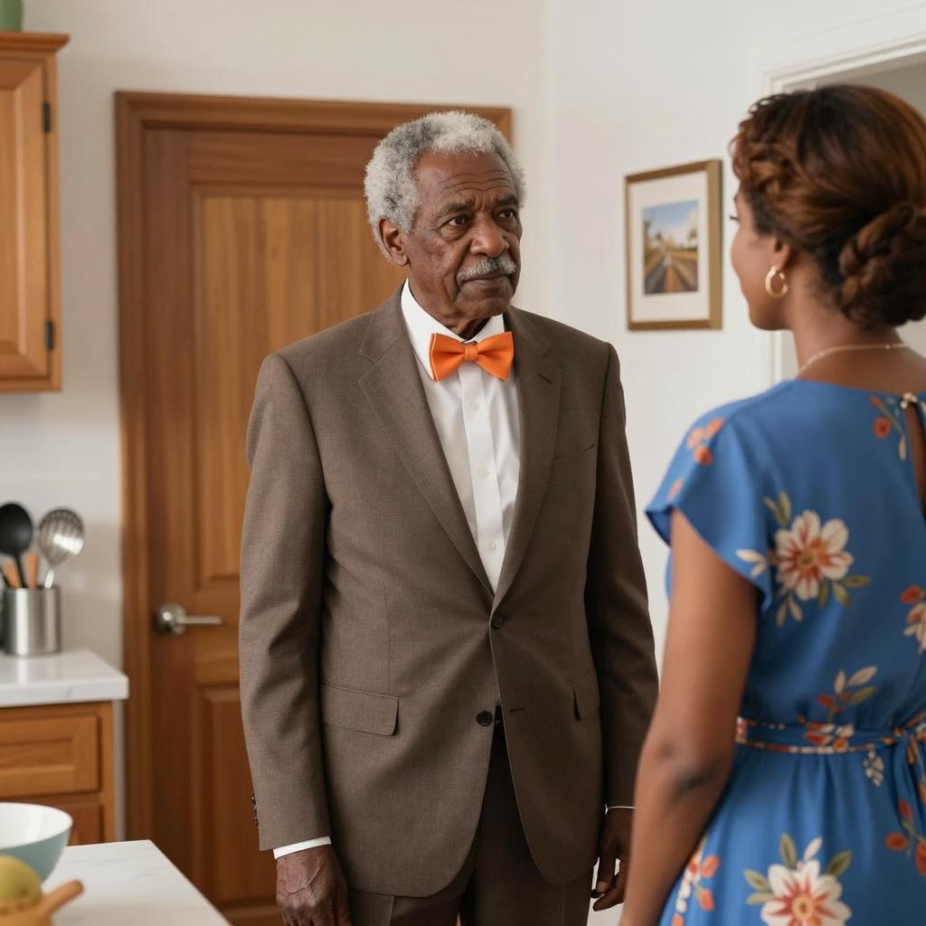Old African American man with gray hair, wearing a light gray suit, white striped shirt, and yellow bow tie, stands in front of a brick house with white shutters and green awnings. Trees and foliage surround the house. Man's expression is slightly concerned. Film-style photograph.