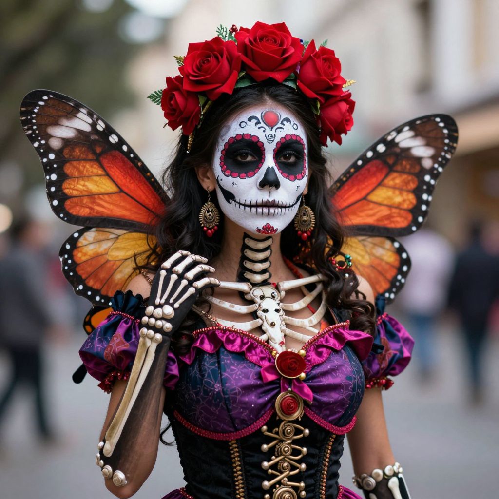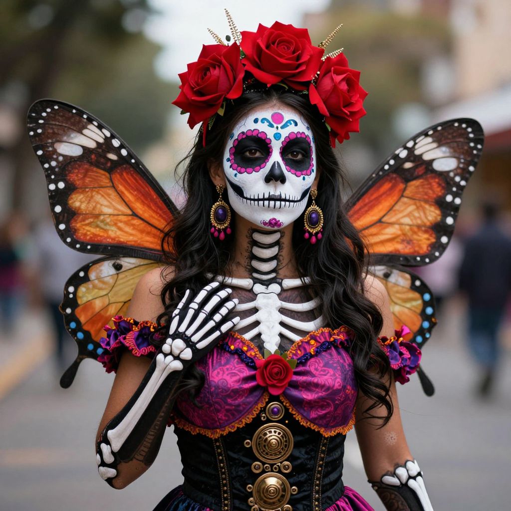A striking digital artwork depicts a skeleton woman performer adorned in a vibrant Day of the Dead costume, featuring intricate face paint, a red rose headdress, and butterfly wings, set against a softly blurred outdoor backdrop, capturing the essence of Dia de los Muertos with a blend of gothic and steampunk aesthetics.
