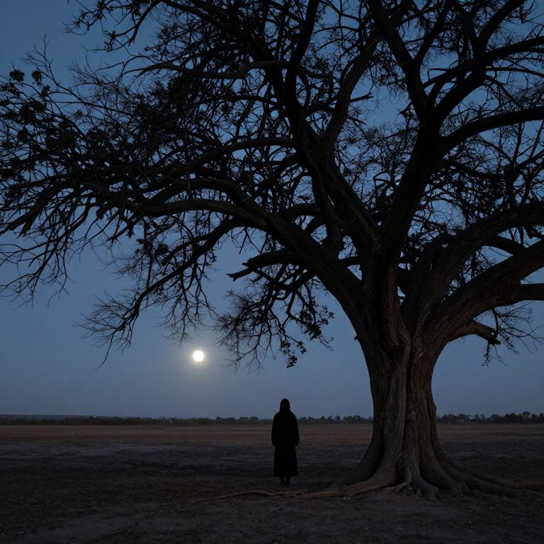 In the twilight embrace of a desolate landscape, a solitary figure stands beneath an ancient, sprawling tree whose gnarled branches reach out like skeletal fingers, embodying the weight of solitude and the quiet melancholy of existence, while the distant moon casts a somber glow over the earth, hinting at the eternal dance between life and decay.