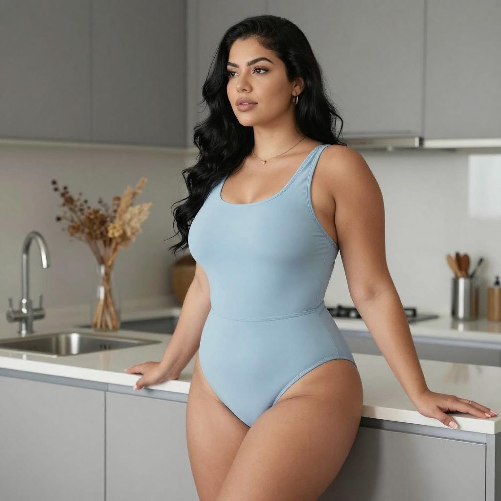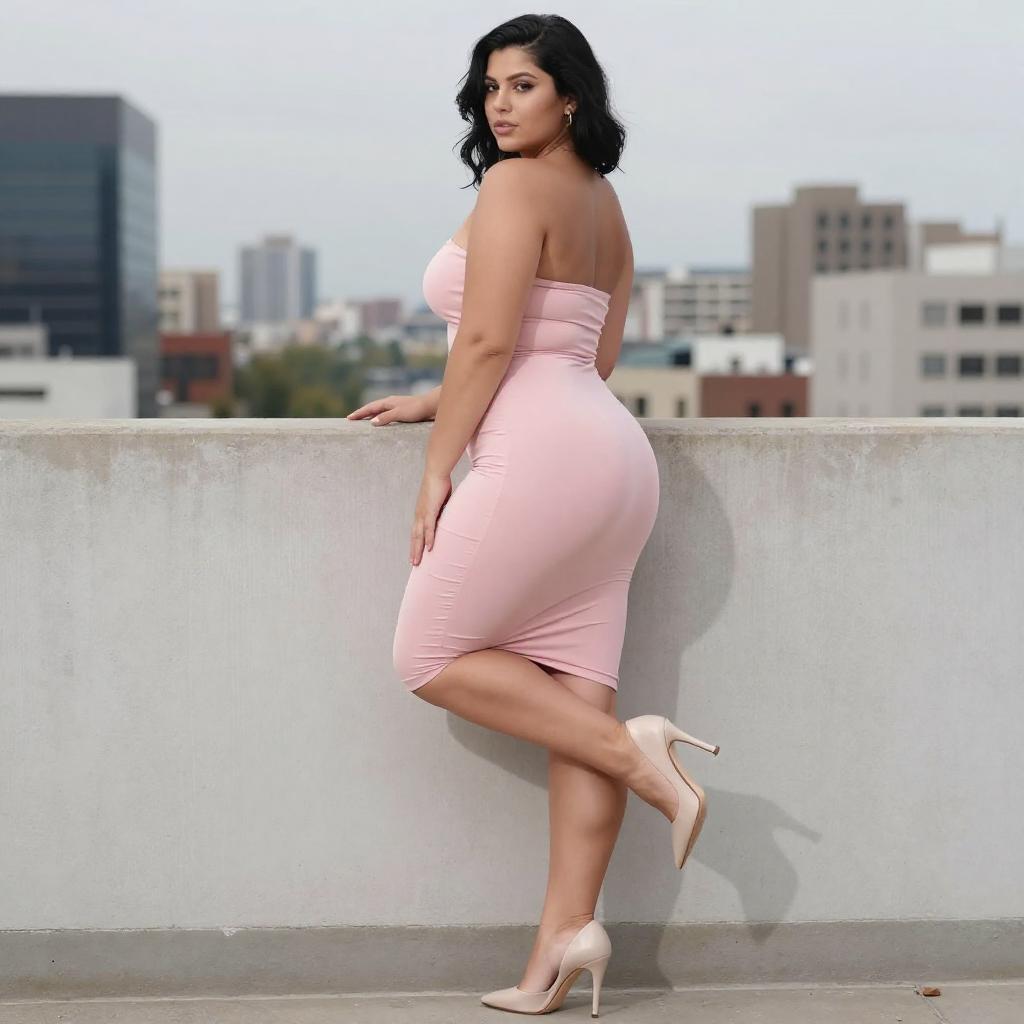 Photograph of a curvy woman with long black hair, wearing a white, deep V-neck, sleeveless dress that reveals her ample cleavage and thighs. She is seated on a ured black and white surface, leaning slightly forward with her right arm resting on the surface. The background features a gold, crinkled metallic wall. Her expression is neutral, and she gazes to the left.