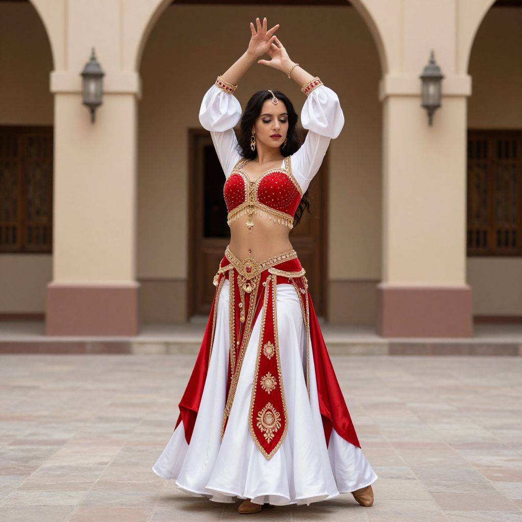 Photograph of a dark-haired woman in a red and white belly dance outfit with gold details, arms raised, standing in a courtyard with arched columns