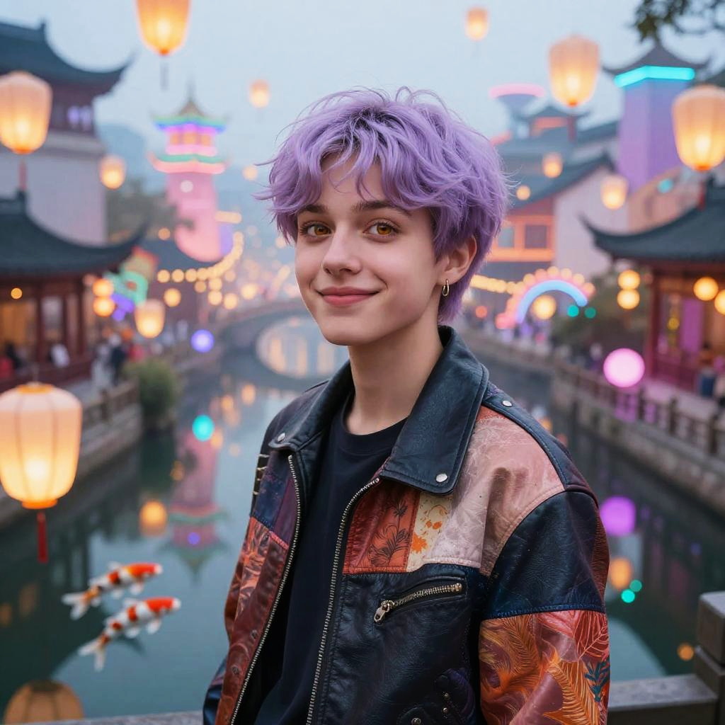 Masked street performer, deep bronze skin, shaved head with intricate gold tattoos, amber catlike eyes, mischievous grin, wearing a layered patchwork cape, brass goggles, fingerless leather gloves, vibrant modern fairytale scene of sprawling neon cityscape, dynamic graffiti walls, electric blues and vibrant oranges, sharp geometric shapes. sharp, focused, vibrant, colorful, clear image