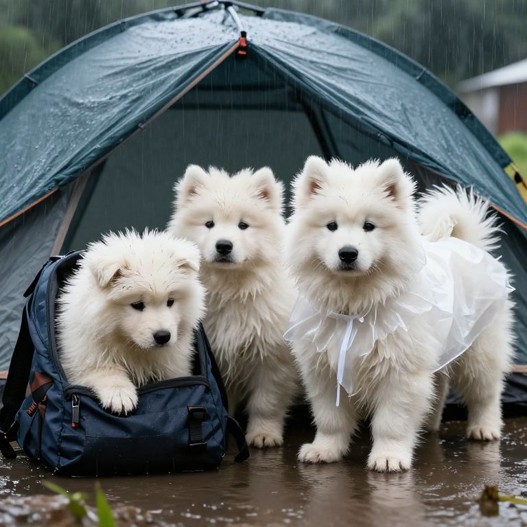 Samoyed puppies caught in a rainstorm while camping, Their soggy fur clings to their bodies, and they huddle adorably under a tarp while puddles form around them, One puppy tries to stay dry in a tipped-over backpack, while another proudly wears a makeshift raincoat made from a plastic bag